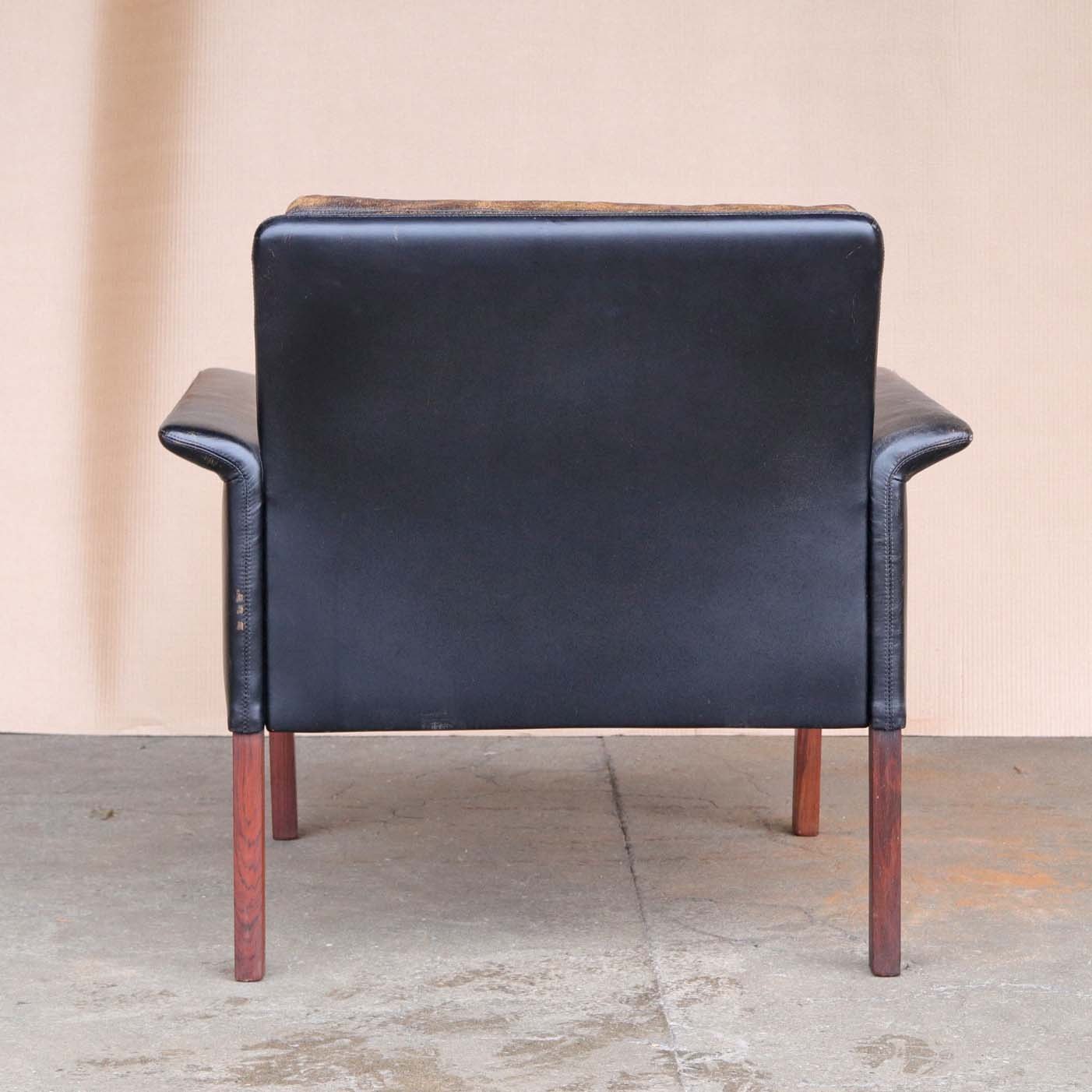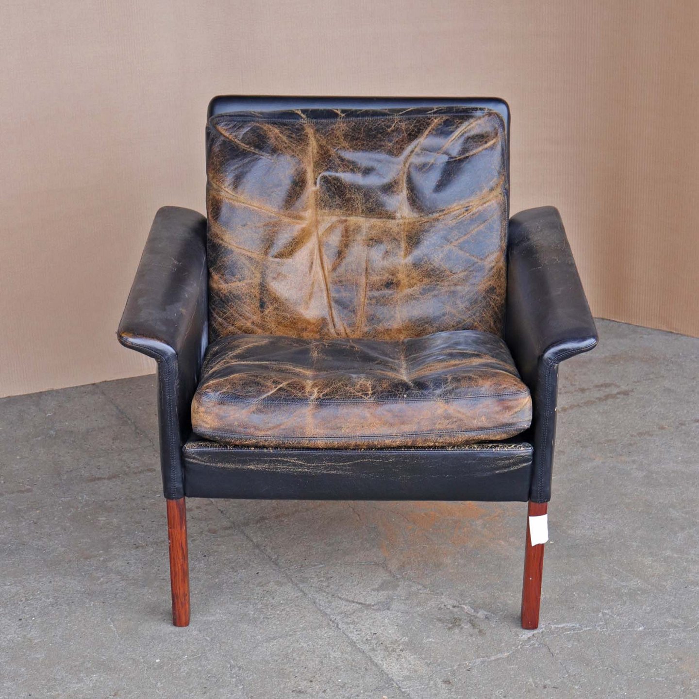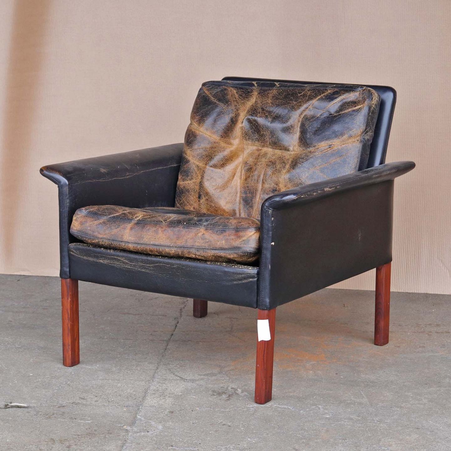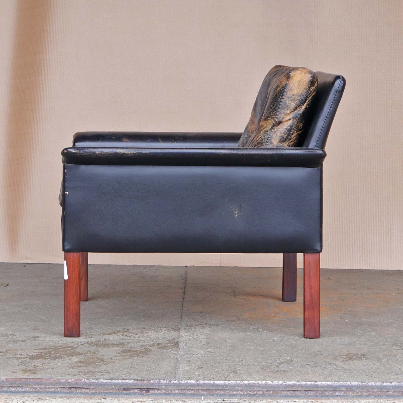 Text available in Danish: Lænestol med stel i lakeret palisander. Stolen betrukket med sort patineret læder