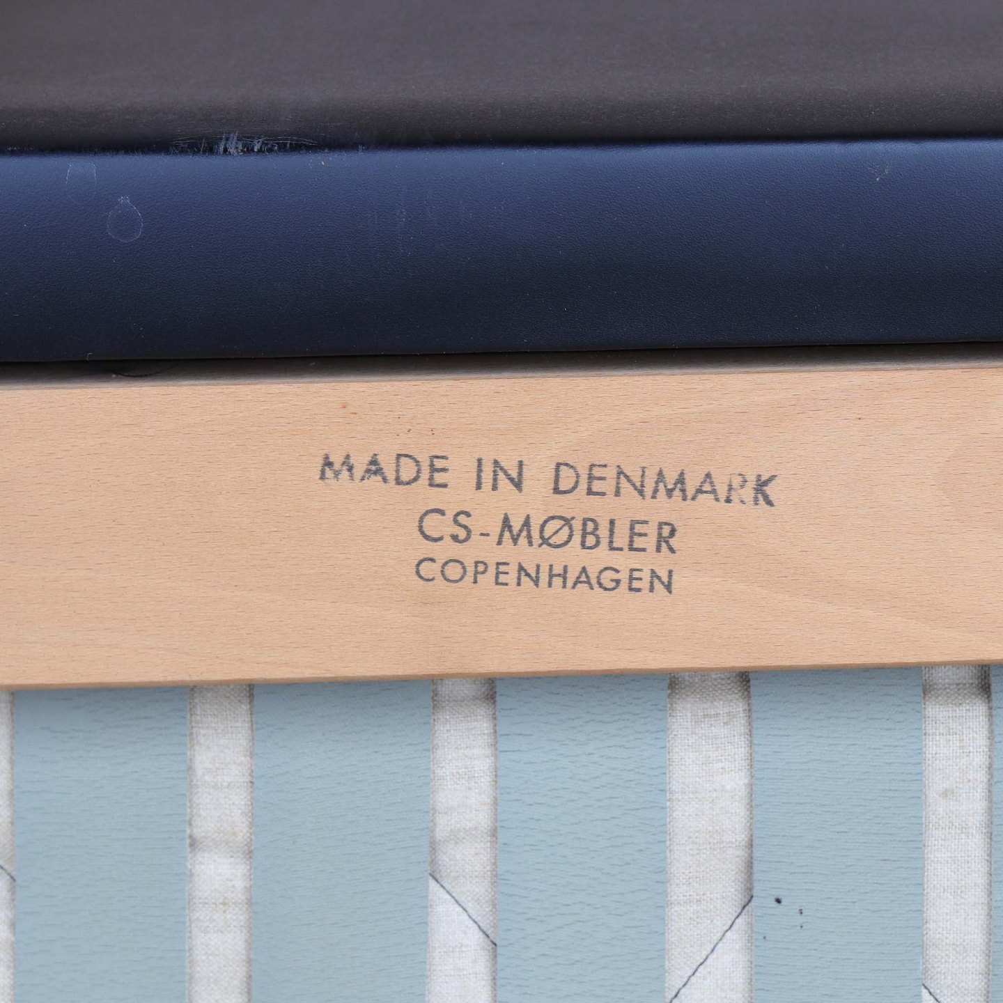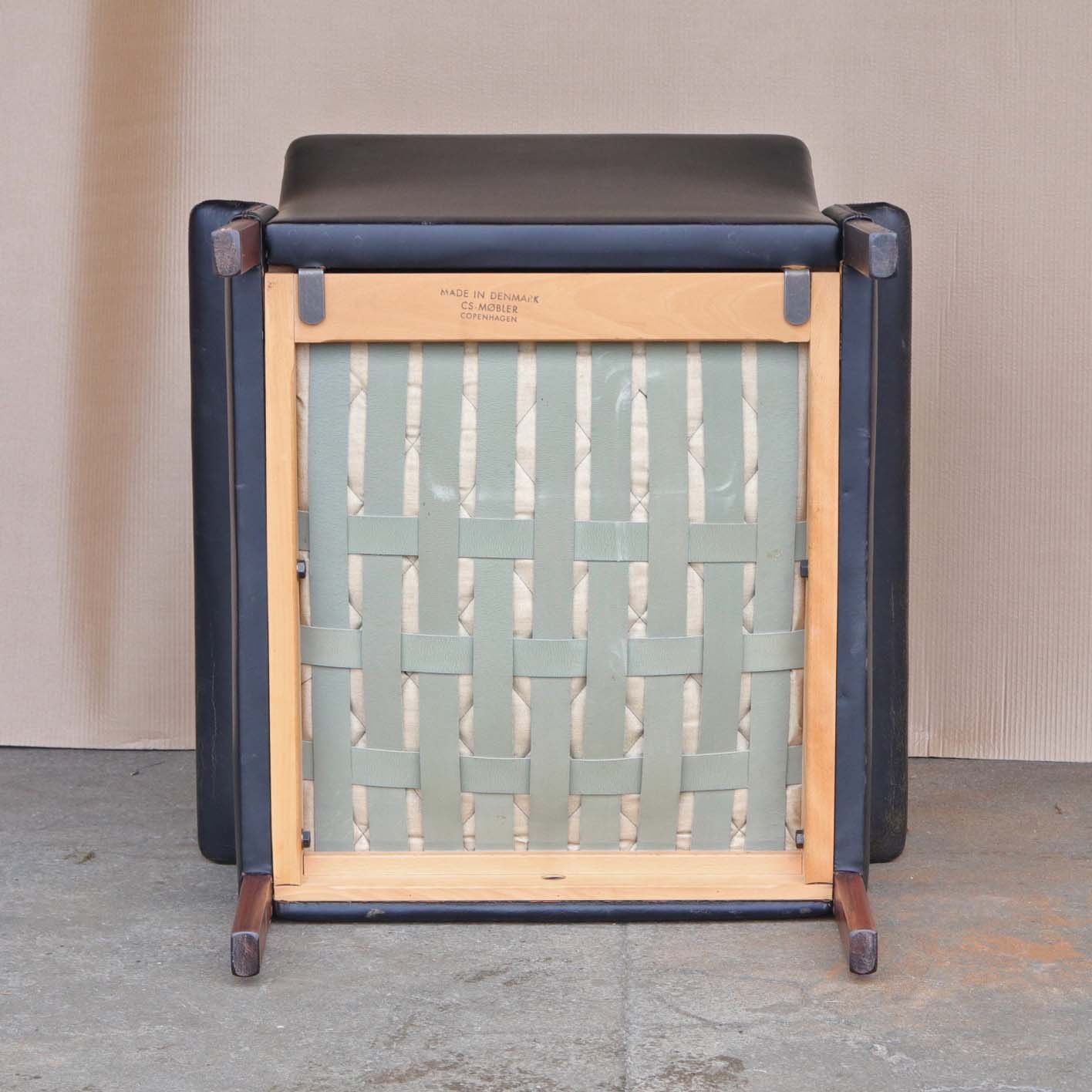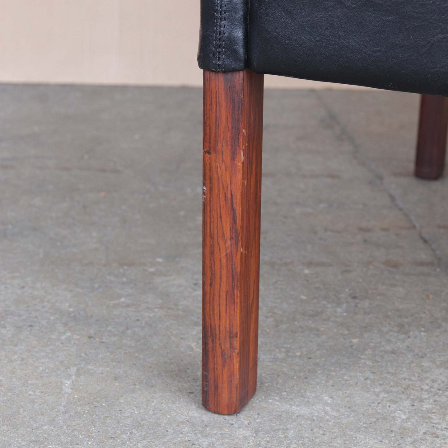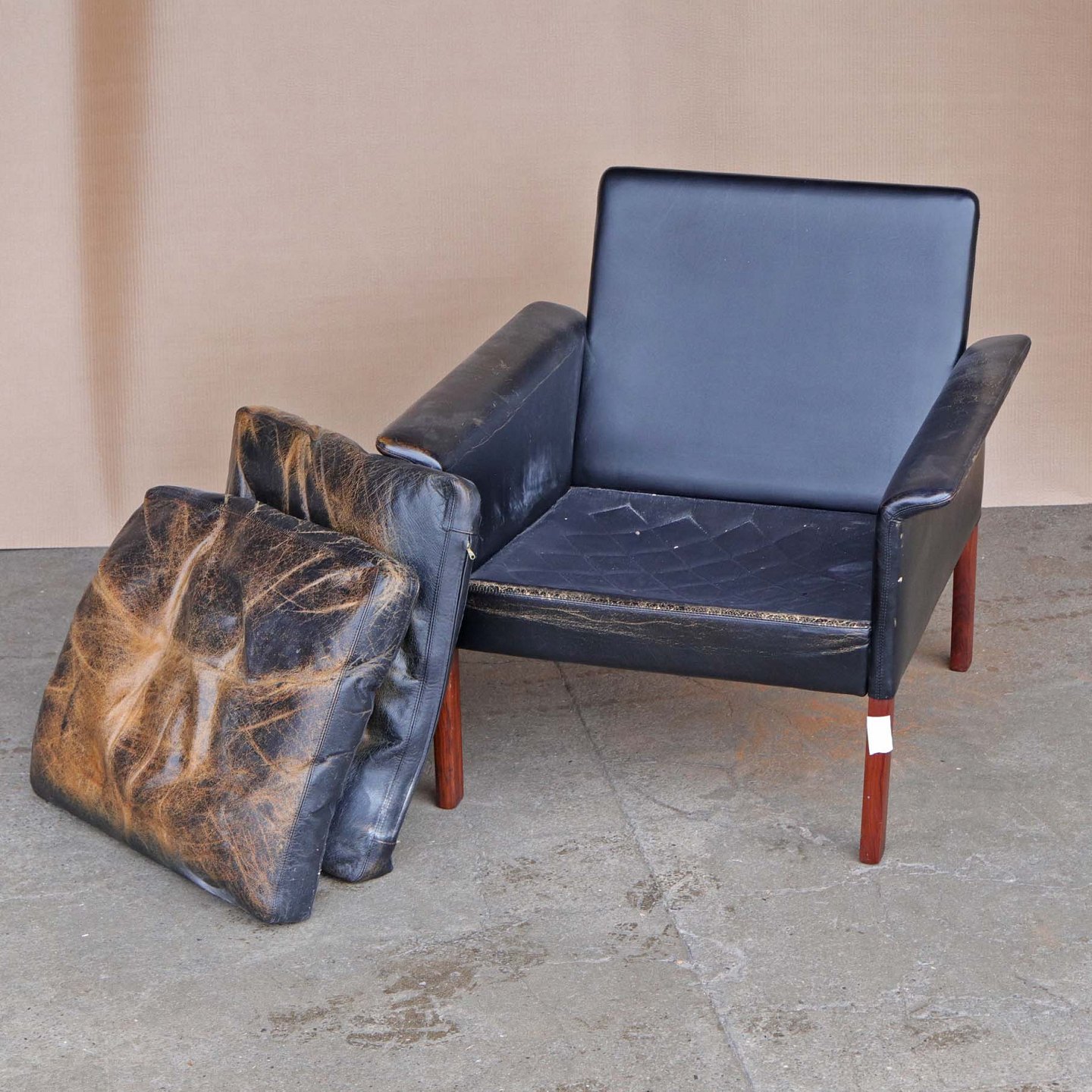 Text available in Danish: Lænestol med stel i lakeret palisander. Stolen betrukket med sort patineret læder