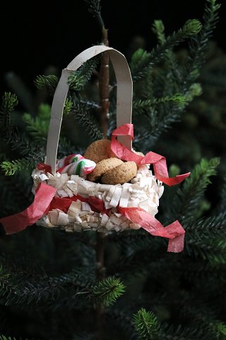 Antique Christmas tree ornament from around 1920 in the shape of a Christmas basket made of cardboard and tissue paper.