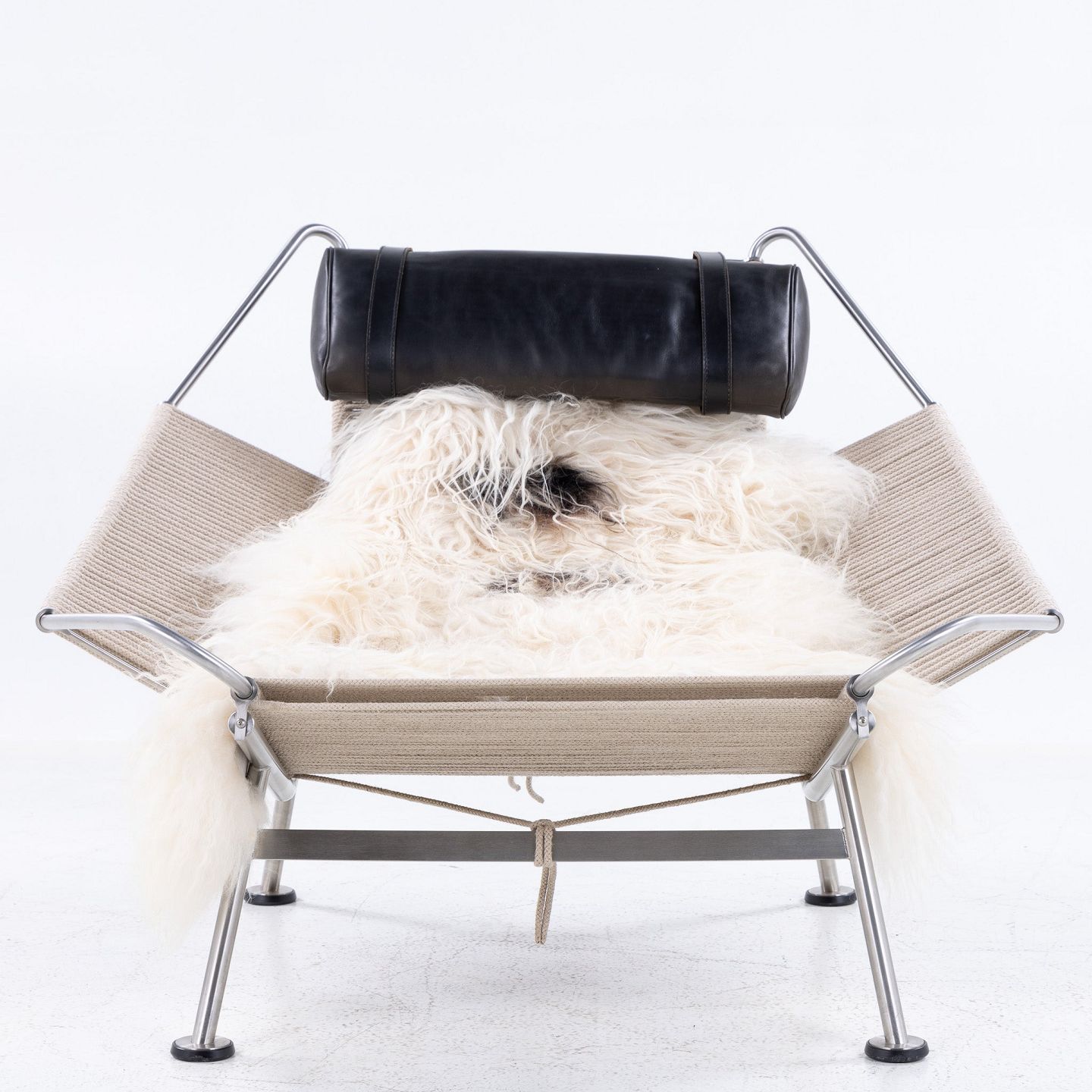 PP 225 - 'Flagline' lænestol m. sort læder nakkepude og løst lammeskind. Stemplet.