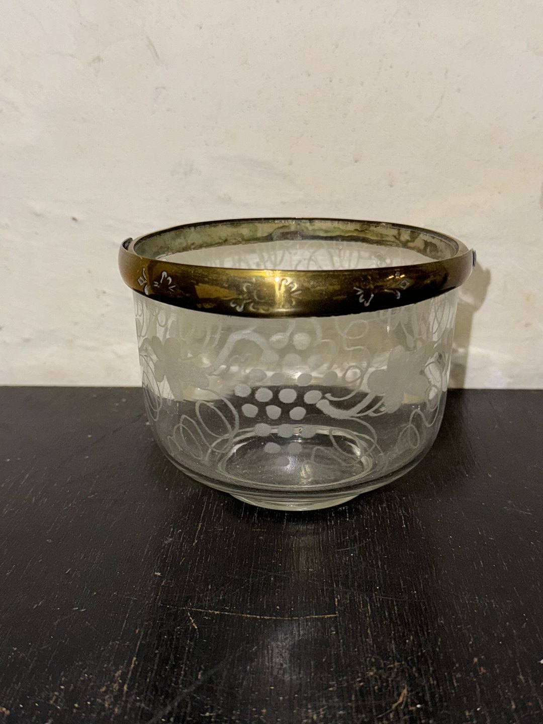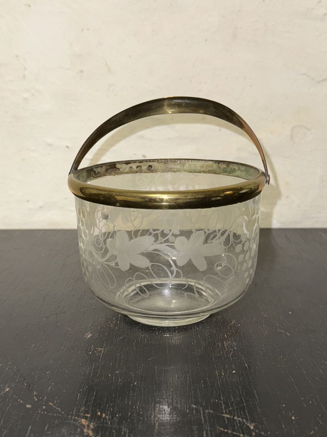 Sukkerskål i glas med vinløvsslibning. Monteret metalhank. Fremstillet i slutningen af 1800-tallet. I god stand. H. 9,5 cm