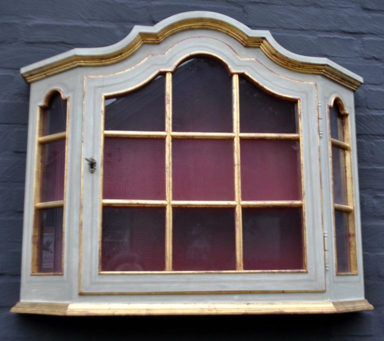 Hanging display case, 20th century Baroque style. Denmark. Lightly painted with gilded moldings. H: 64 cm. W: 80.5 cm. D: 19 cm.