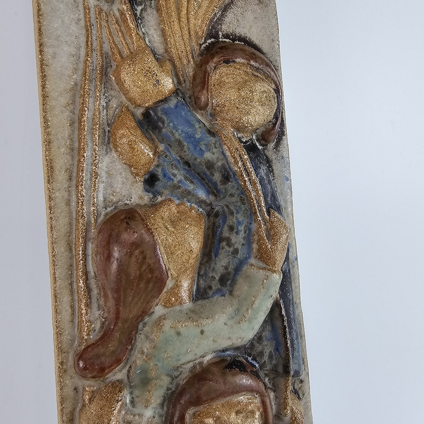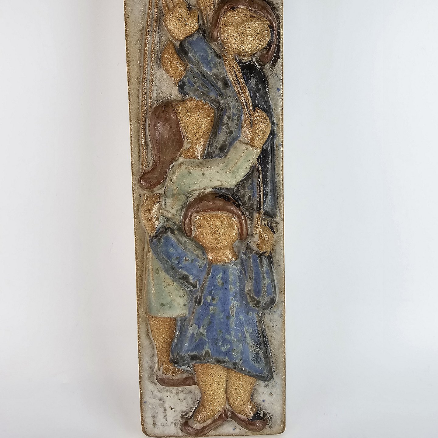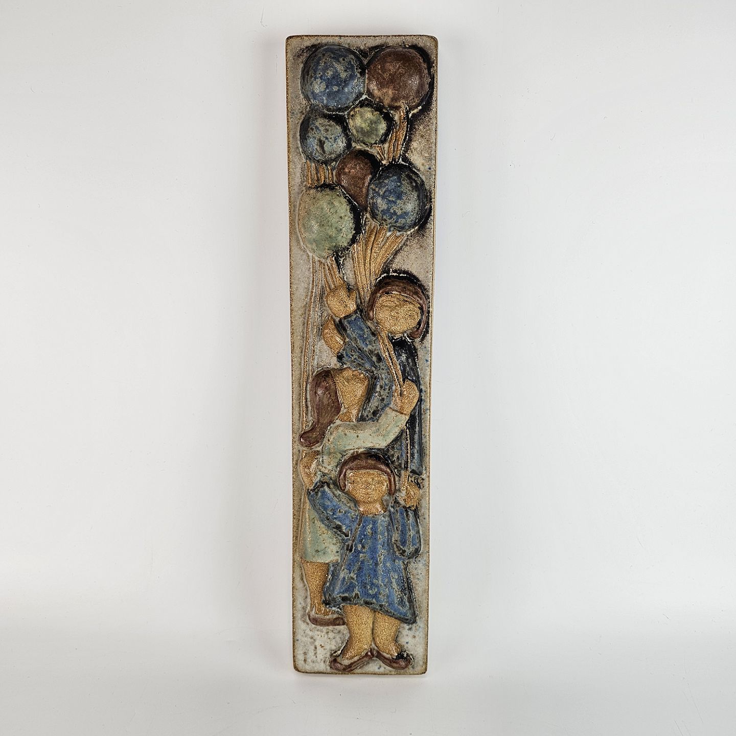Text available in Danish: Vægrelief i keramik, med motiv af tre børn med balloner.