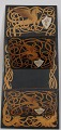 Newspaper display in wood with Viking ornamentation with dragons and griffin. Lacquer work in black, green and red on birch wood. Dated to 1898, in conjunction with a 25th anniversary - maybe a silver wedding anniversary? With two shelves. With monogram. H: 63 cm. W: 28 cm.