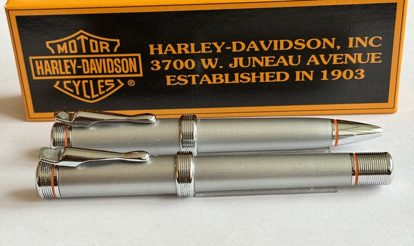 Metallic gray Harley Davidson fountain pen set with ballpoint pen in original box. Both pens appear to be in good condition with no damage or repairs. The ballpoint pen writes fine with an old refill inside. The fountain pen is to be used when a new ink cartridge is inserted. All parts original in this H. D. writing set including the box. The fountain pen is 12 cm long.