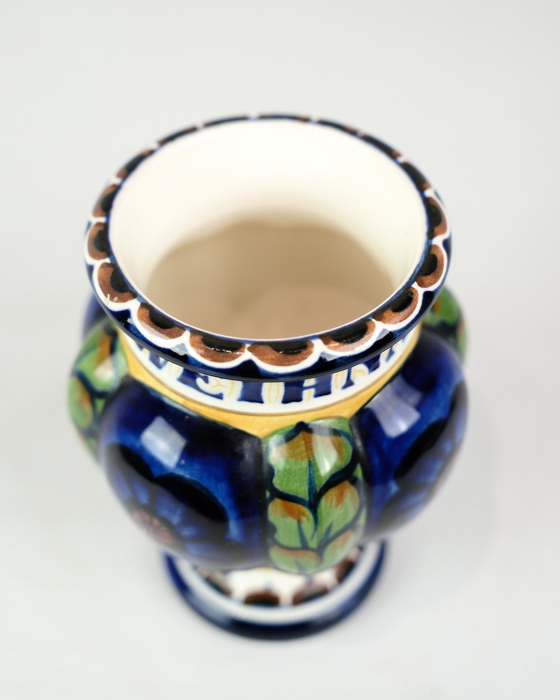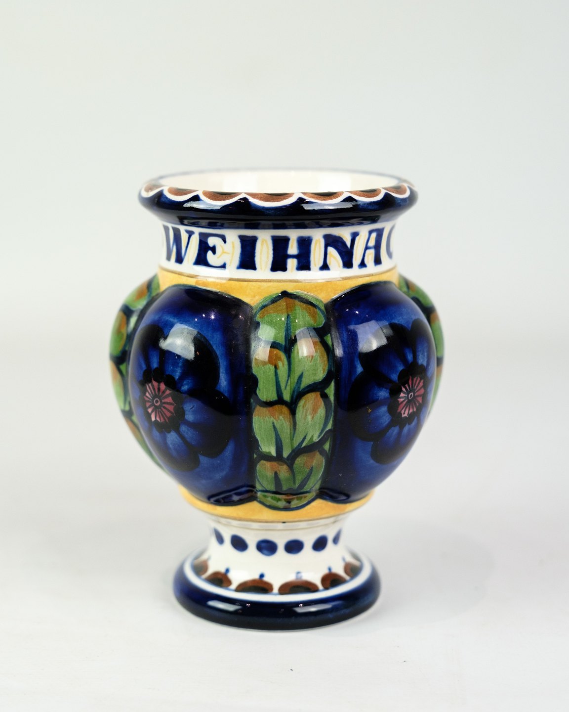 This 1917 Christmas vase, model 1126/1005, is made of earthenware and decorated with an elegant motif of flowers and green leaves. The classic and detailed design makes it a charming and timeless Christmas decoration that brings historical charm into the home.