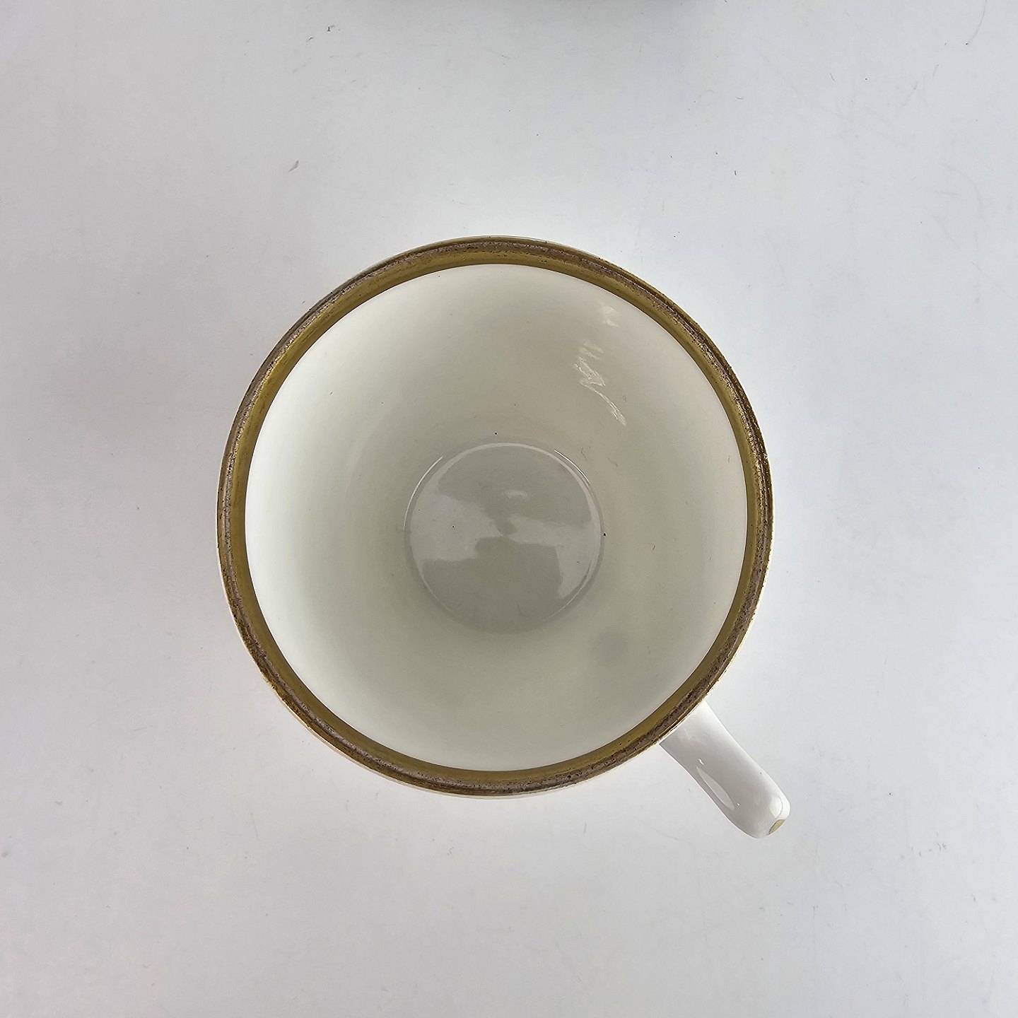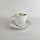 Hvidt riflet porcelæn med guldkant og motiv af æbleblomster.