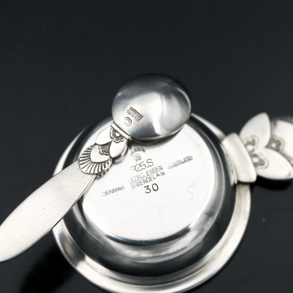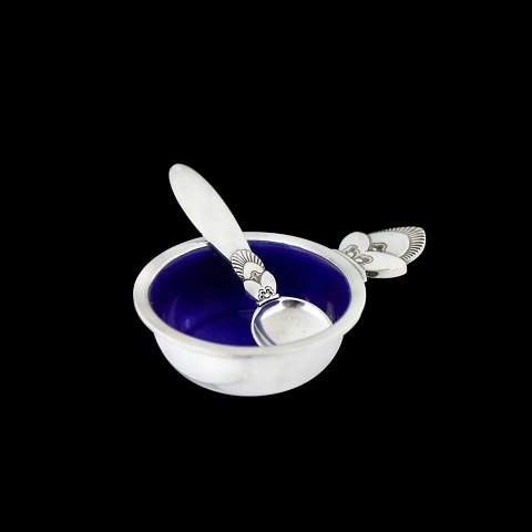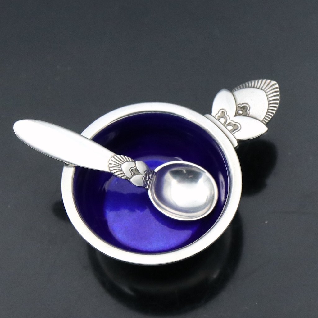 Georg Jensen. Sterling Silver Salt Cellar #102 with Enamel and Spoon 103 - Cactus.