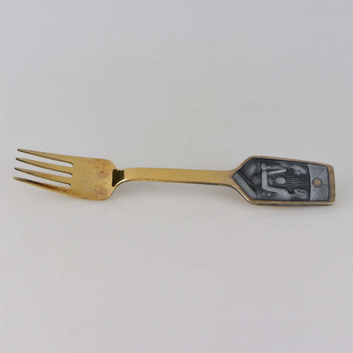 Julegaffel i forgyldt sterling sølv med indlagt emalje med teksten Jul 1973 og motiv af far, mor og barn