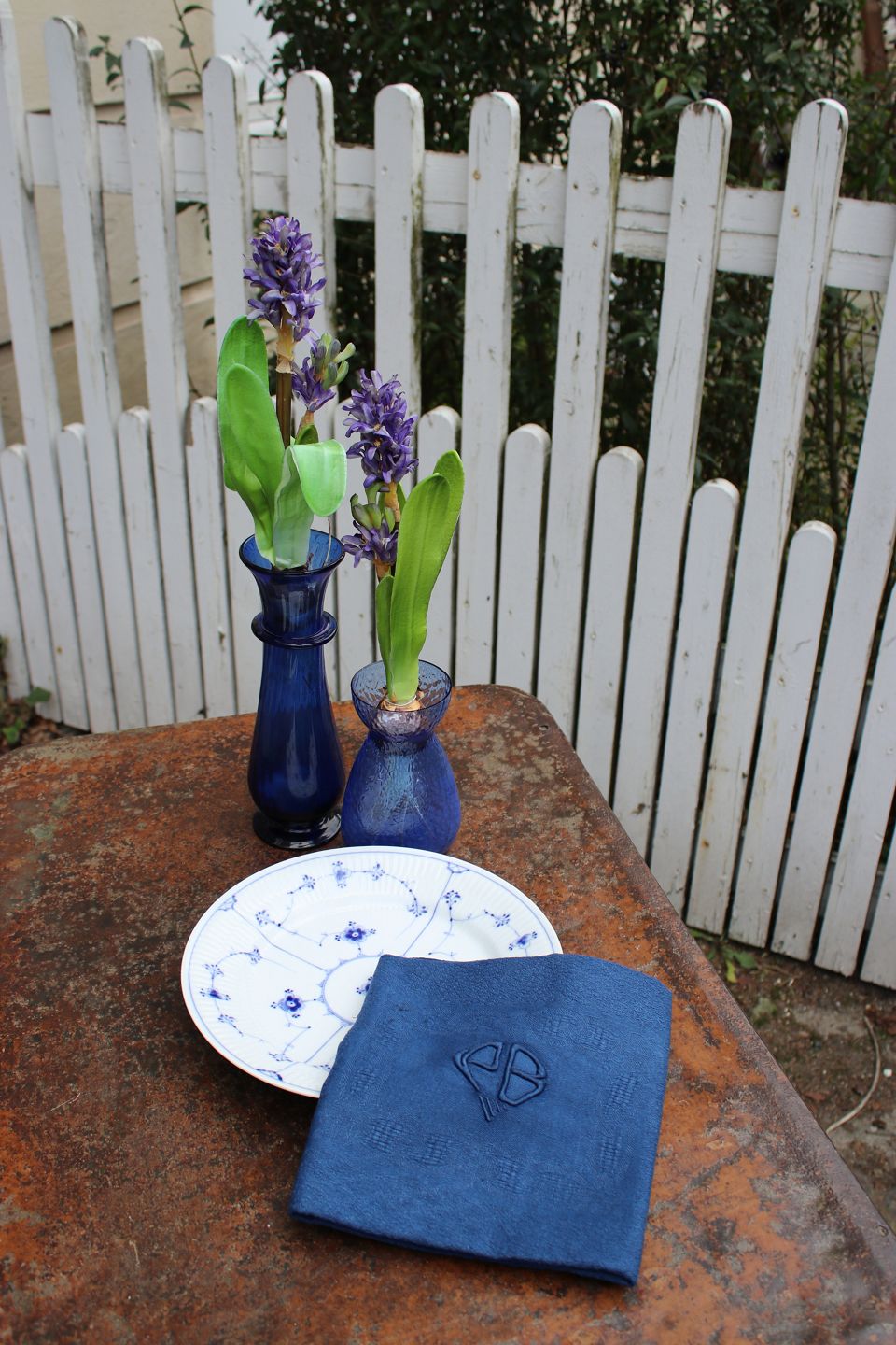 Servietterne er indfarvet i en flot blå farve der matcher super flot til Royal Copenhagens blå spisestel Musselmalet & Blå Blomst...