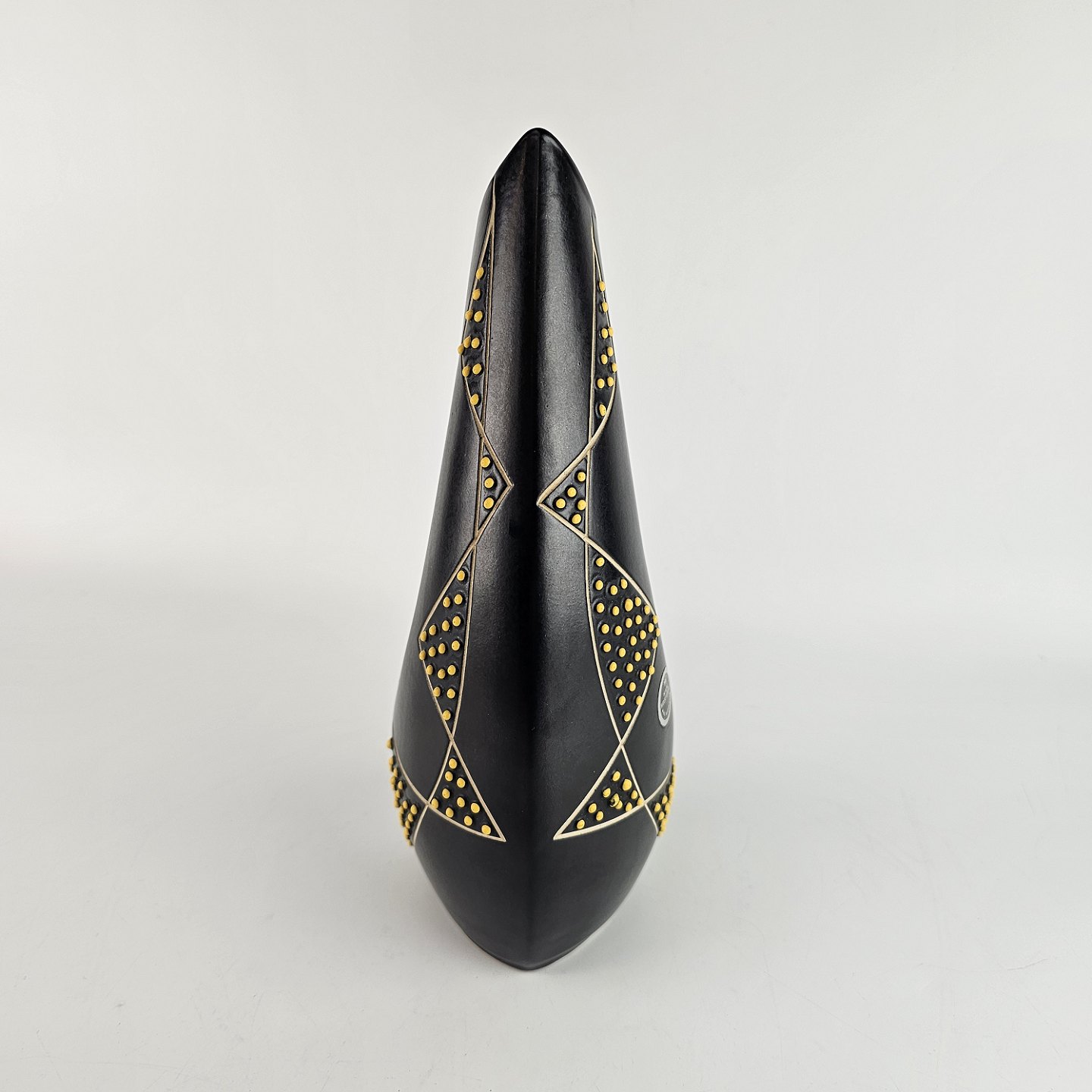 Sortglaseret vase med mønster af gule prikker, placeret i trekanter.