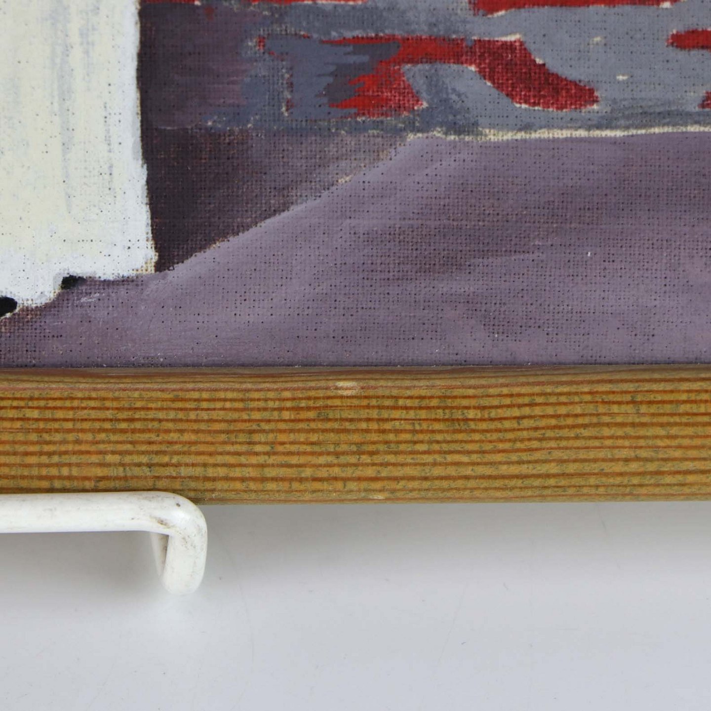 Indrammet maleri på læred i træramme med motiv af kvinde ved trappenedgang. Dateret år 1987