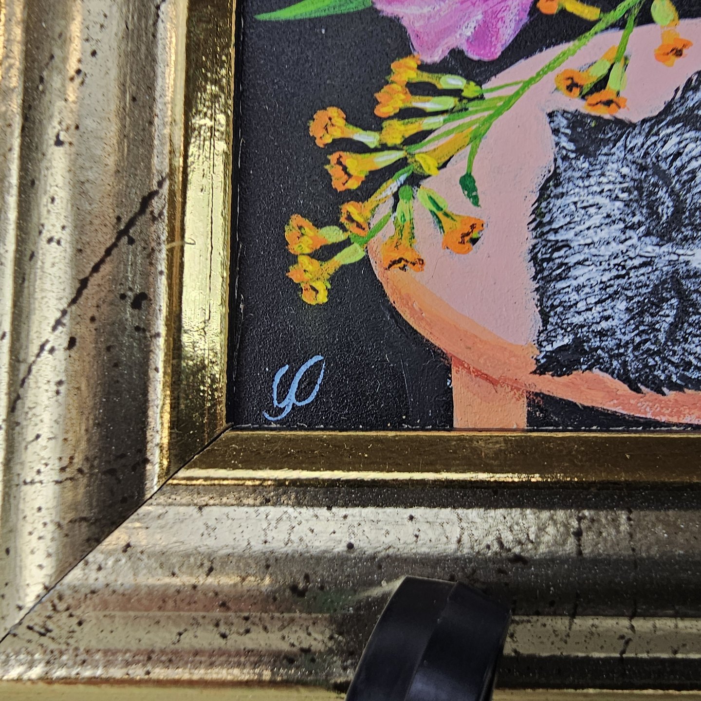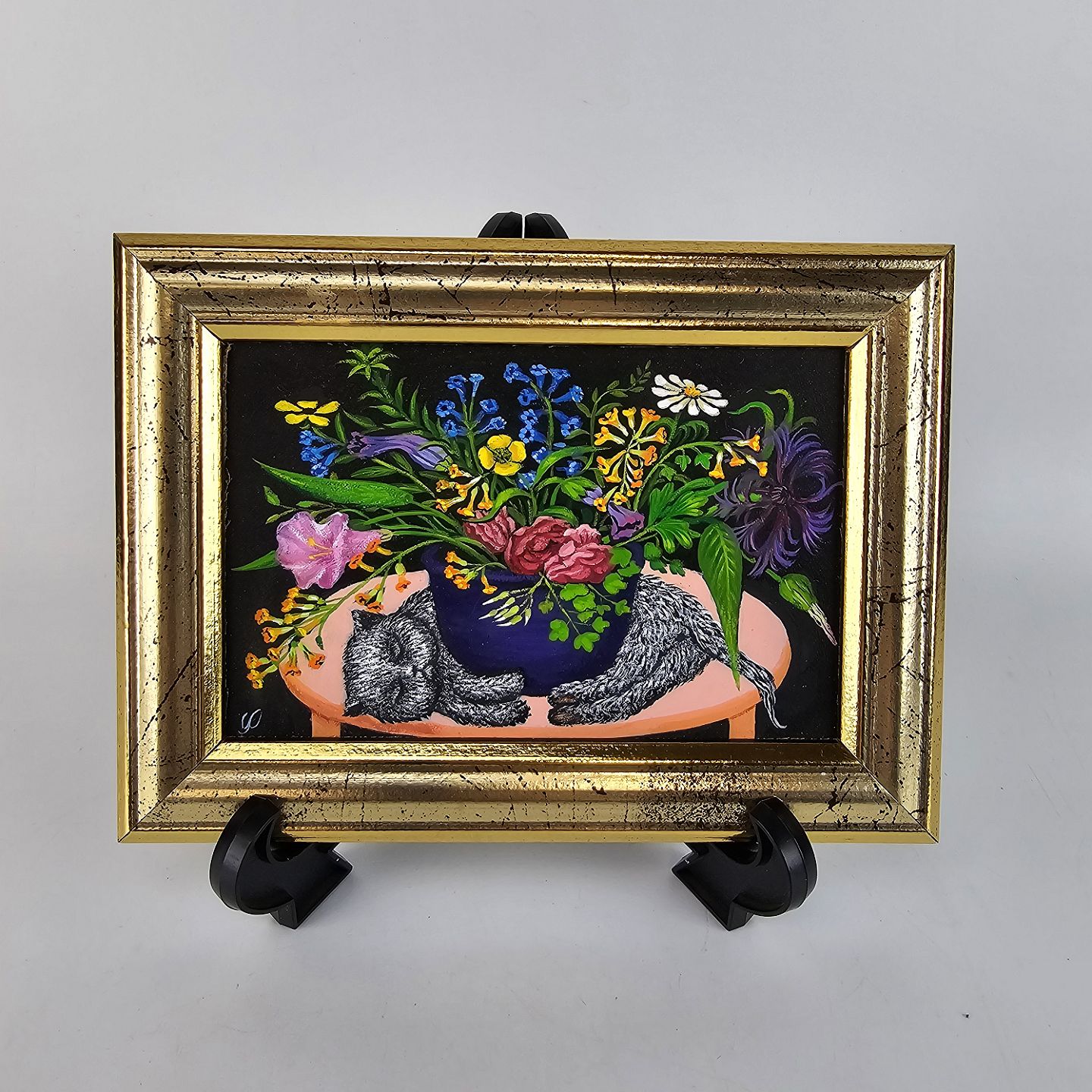 Maleri med motiv af en kat under en farverig buket blomster, på sort baggrund.