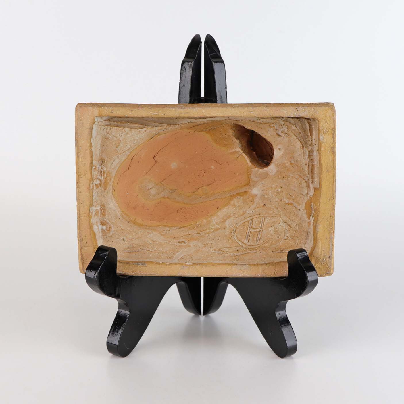 Relief i glaseret keramik med motiv af pindsvin ved drikkeskål på blå baggrund.