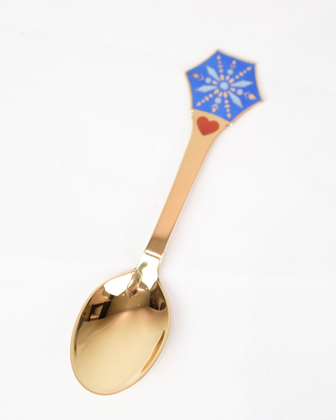 Christmas spoon made by Anton Michelsen in Sterling silver gold plated, vintage 1976. Designed by the painter Gudmund Olsen in bluish colors and motif of snow crystal.