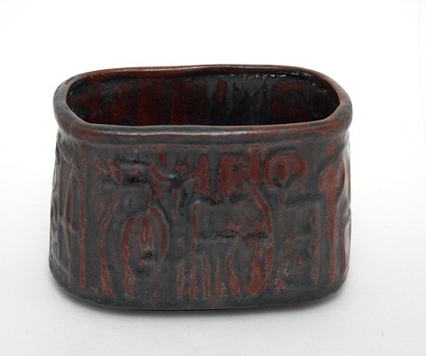 Text available in Danish: Desiree stentøj Denmark, Aflang skål eller vase i rødbrun glasur med møsnter i relief. Formnr. 4010. Højde 10,5 cm. Længde 16 cm. Bredde 11,5 cm. God stand. Pris: 375 kr.