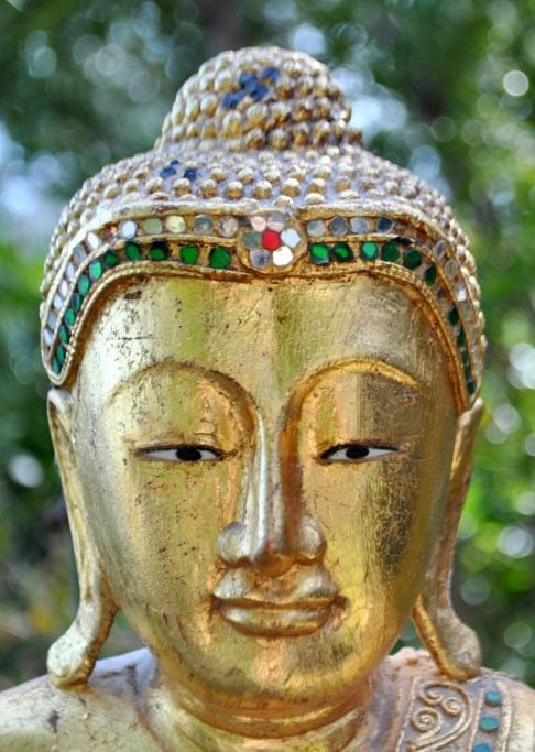 Stående Buddha i forgyldt træ, 20. årh. Thailand. Forgyldt med ilægninger af grønne, røde og klare glas. H.: 81 cm.