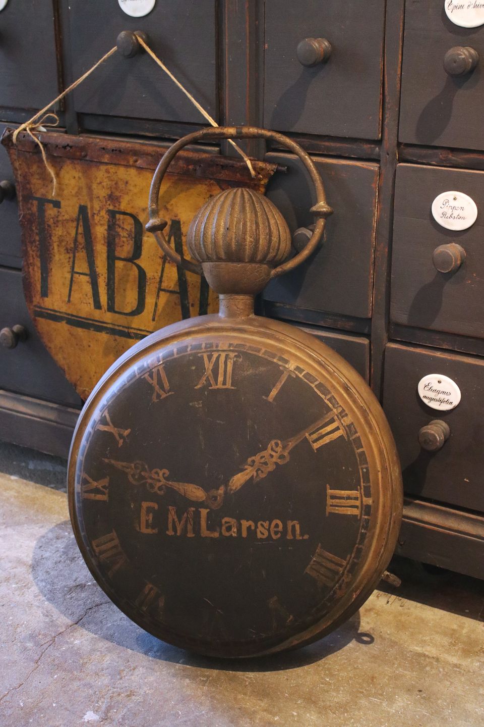 Dekorativt 1800 tals udhængsskilt fra en urmager butik i form af gammelt lommeur fremstillet i kobber og metal med gammel bemaling og en rigtig fin patina. H: 71cm. B: 48cm. D: 17cm. Urskive dia.: 48cm.