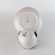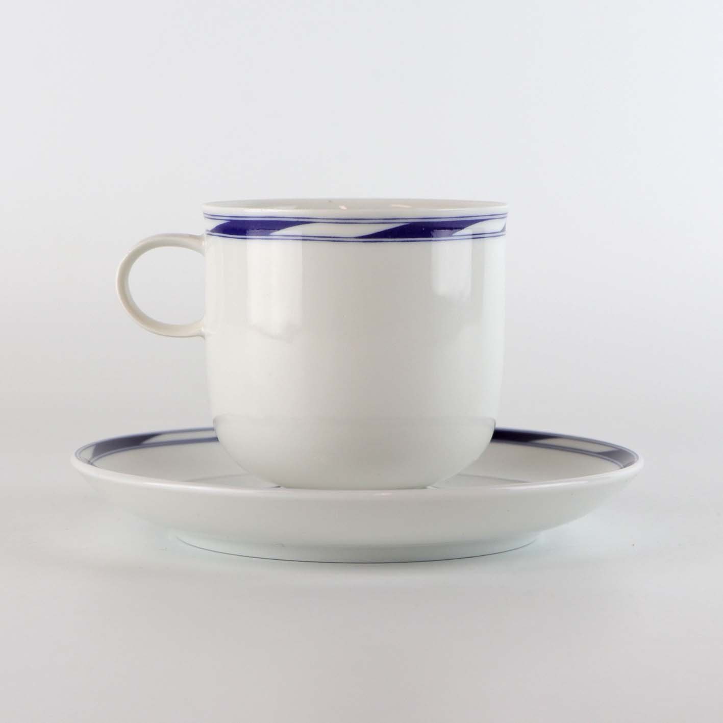 Stel i glat hvidt porcelæn med geometrisk dekoration i mørkeblå streg langs kanten.