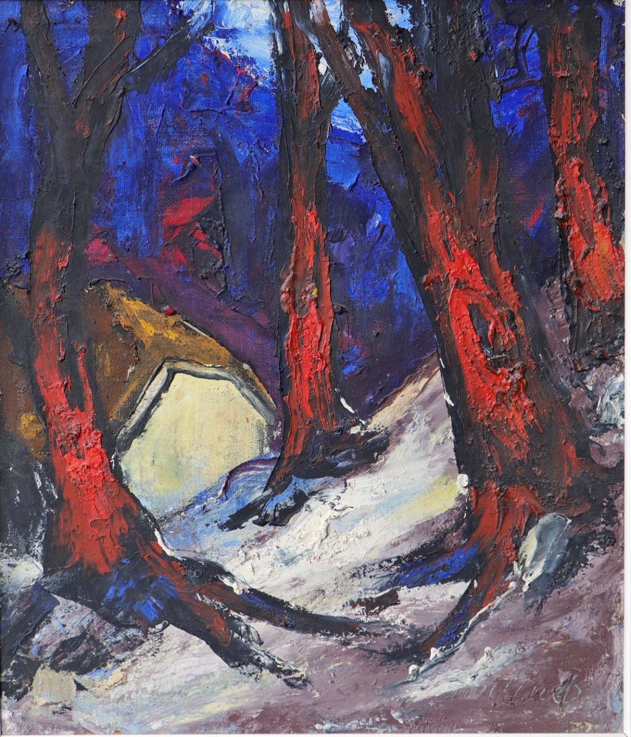 Maleri på lærred monteret i hvidmalet træramme med motiv i struktureret maling af et hus ved skåning omgivet af træer.