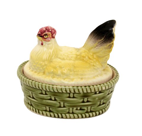 Skøn gul æggehøne i grøn flettet kurv udført i fajance. Højde 14 cm. Længde 16 cm. Flot stand med lettere overfladekrakelering. Pris: 525 kr.