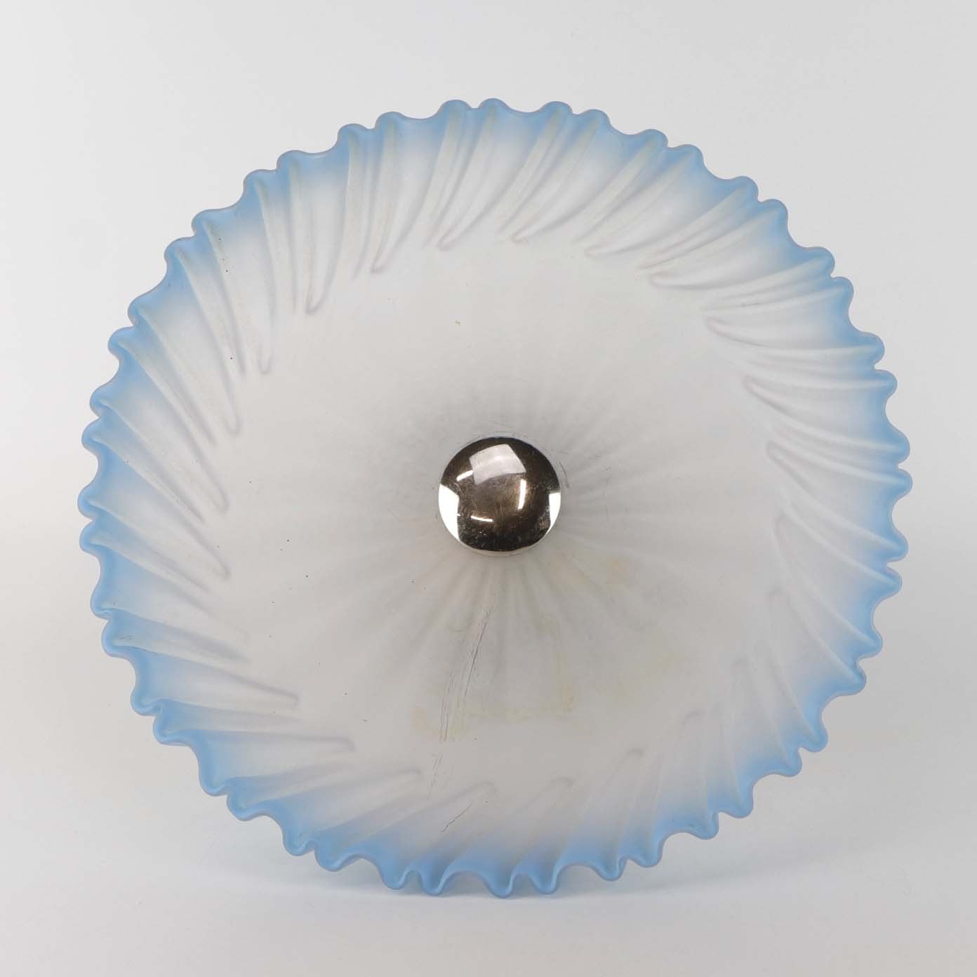 Text available in Danish: Visitkort holder i glas og metal. Holderen er udformet tåget hvidt glas med blå bølget kant sat på en fod af dekoreret metal. Dateret til år 1900-1910