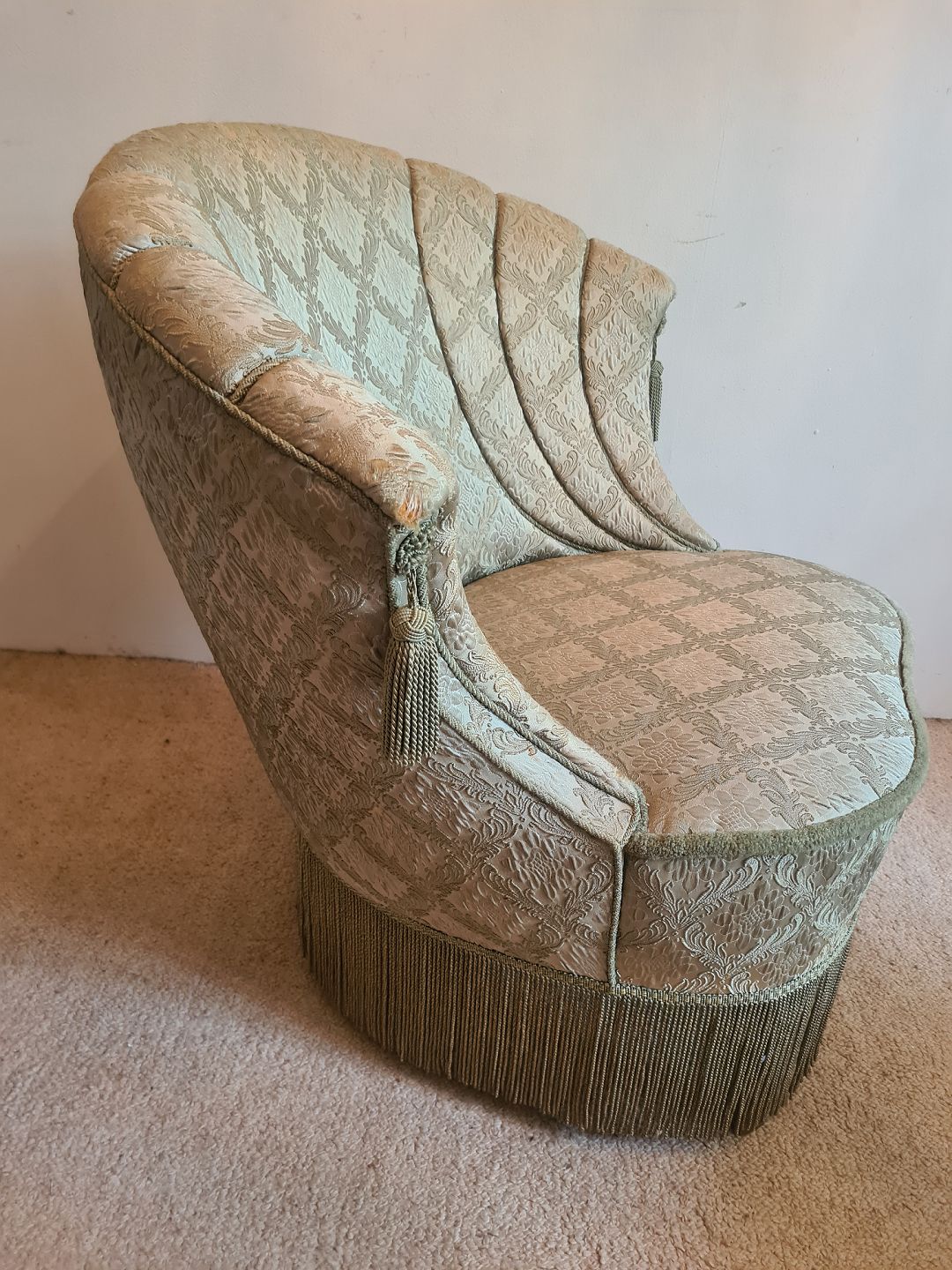 Text available in Danish: Overpolstret lænestol fra 1940'erne med flæser. Fremstår pæn, god og udmærket stabil, dog med tyndslidt polstring på det yderste af begge armlæn. (Billede)