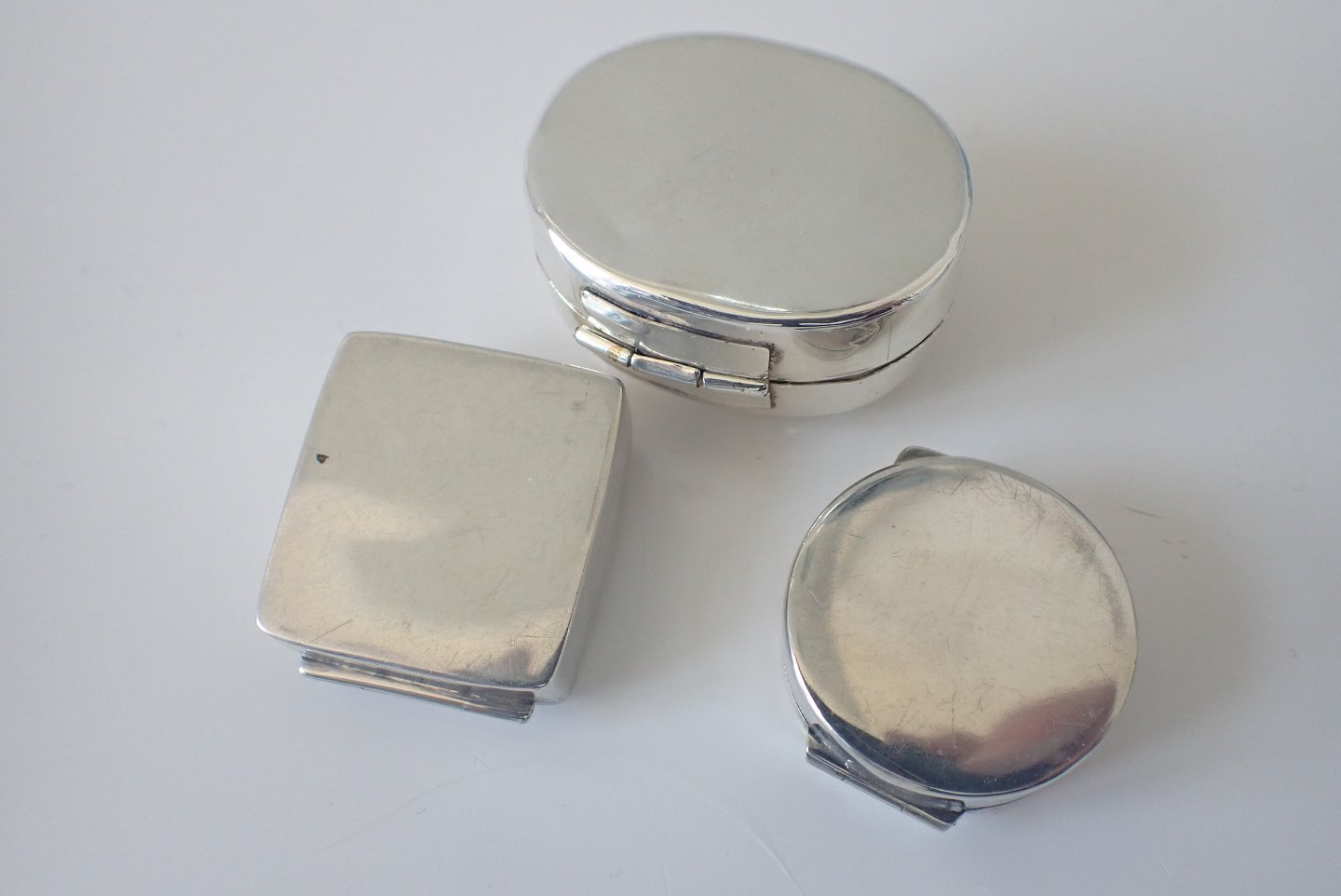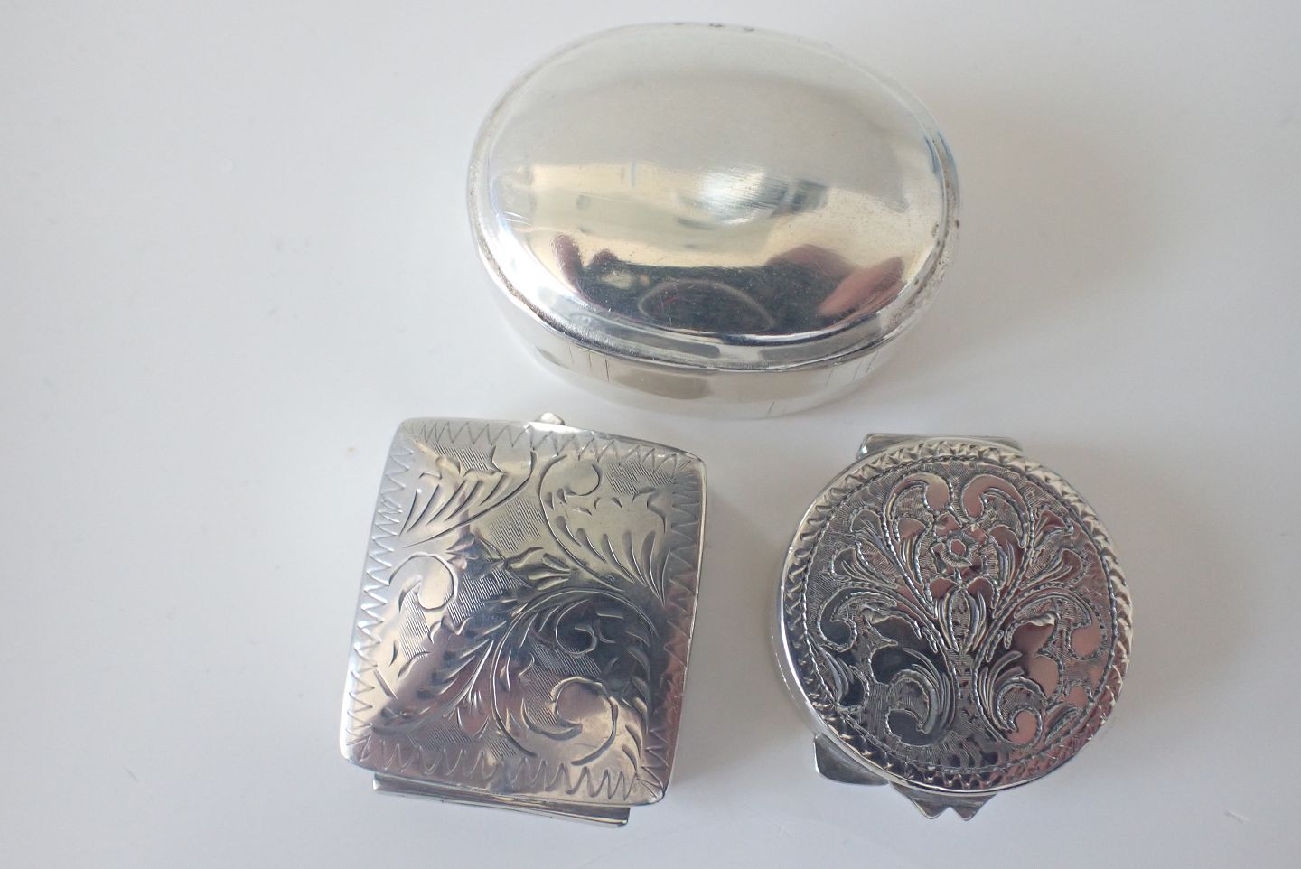 Text available in Danish: 3 pilleæsker. 2 i sterling sølv og en i plet.