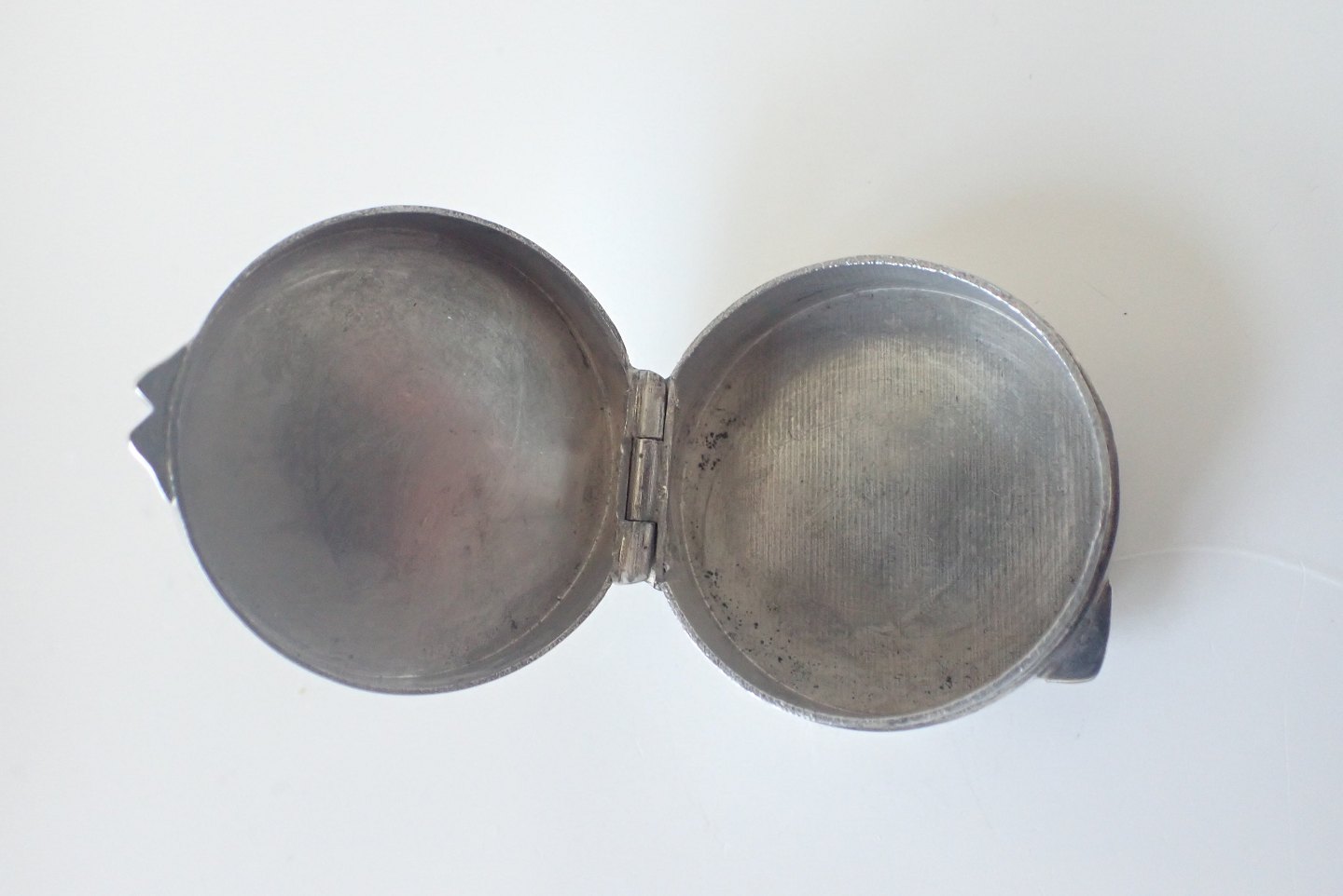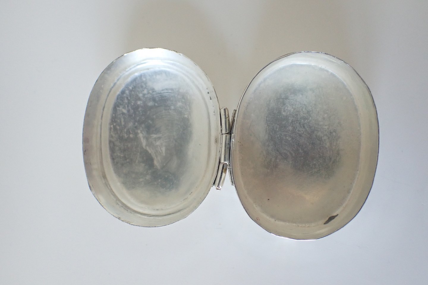 Øverst: Glat, oval pilleæske i pletsølv (nyforsølvet). Længde: 4,4 cm. Bredde: 3,6 cm. Højde: 2,4 cm. I fin stand. Pris: 300 kr.