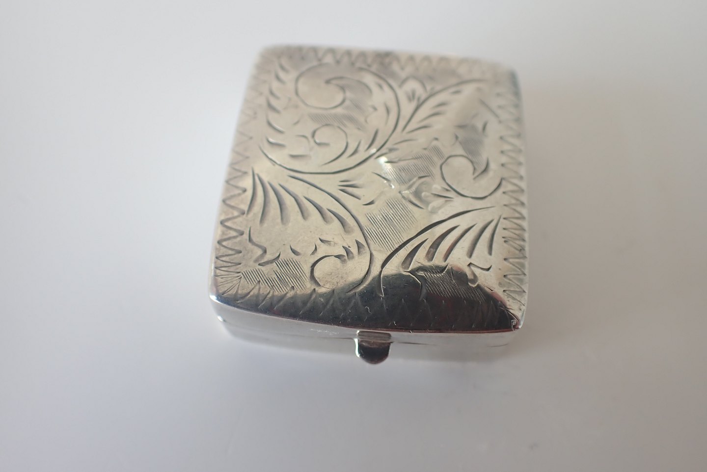 Nederst til venstre: Firkantet pilleæske i sterling sølv med stiliseret bladdekoration på låget. Stemplet 925. Vægt: 13 gram. Diameter 3 cm. Højde: 1,3 cm. I fin stand. Pris: 425 kr.