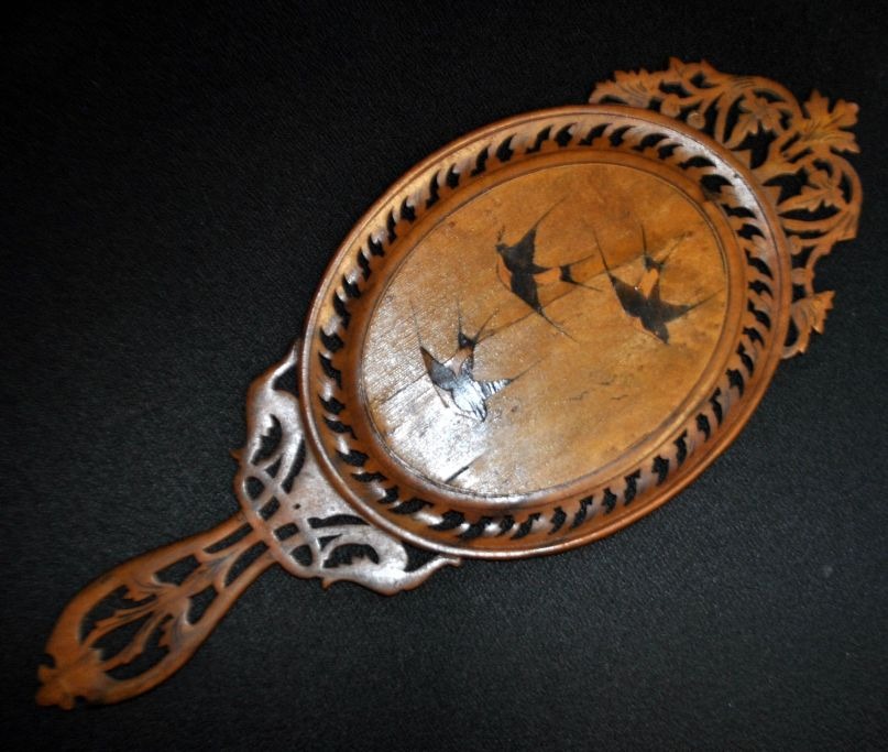 Sorrento hand mirror, 19th century. Italy. Polished olive wood with inlays in the shape of flying swallows and text: Ricordo. Faceted mirror. L.: 40.5 cm. W.: 17 cm.