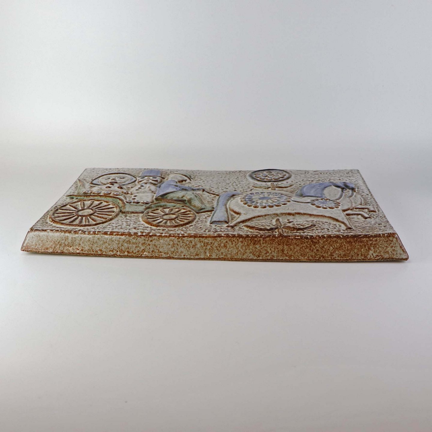 Relief i glaseret stentøj med motiv et par på karret tur med kusk og heste. Nr. 3582