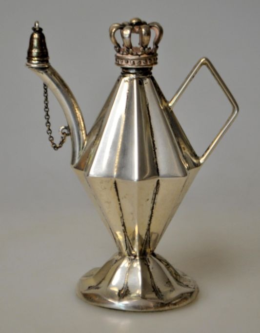 Hugo Grün small oil lamp in silver, 20th century. Copenhagen, Denmark. Stamped: 835S H.Gr. With lid in the shape of a royal crown. With handle and spout. On a filled foot. H. 9 cm.