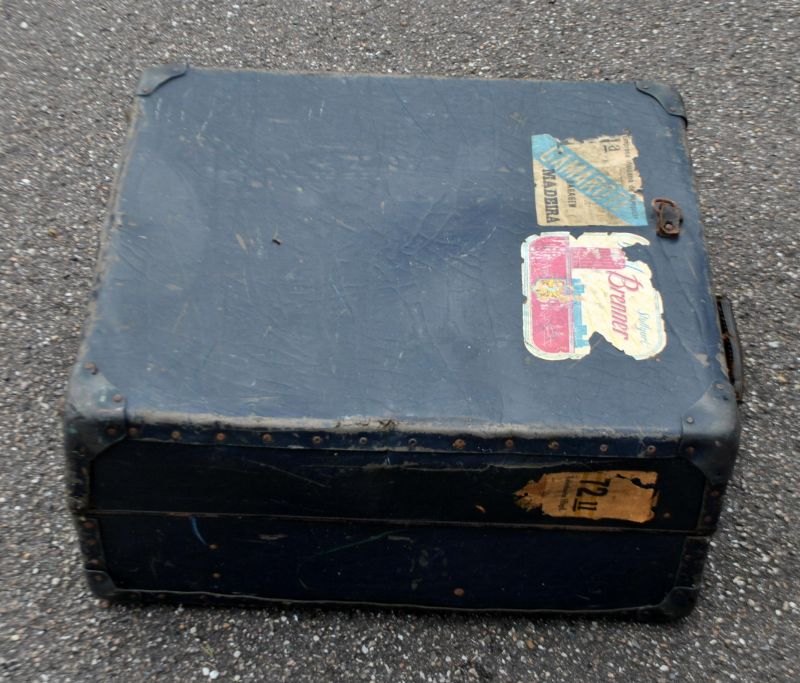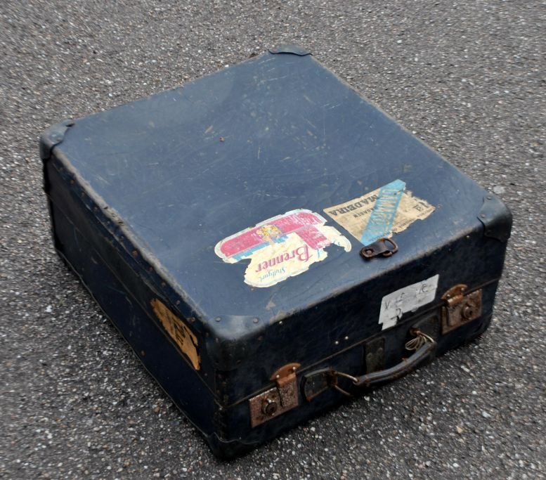 Suitcase, 20th century. With German labels. Wide handle. Two locks, rusty and without key. L: 54 cm. W: 49 cm. H: 26 cm.