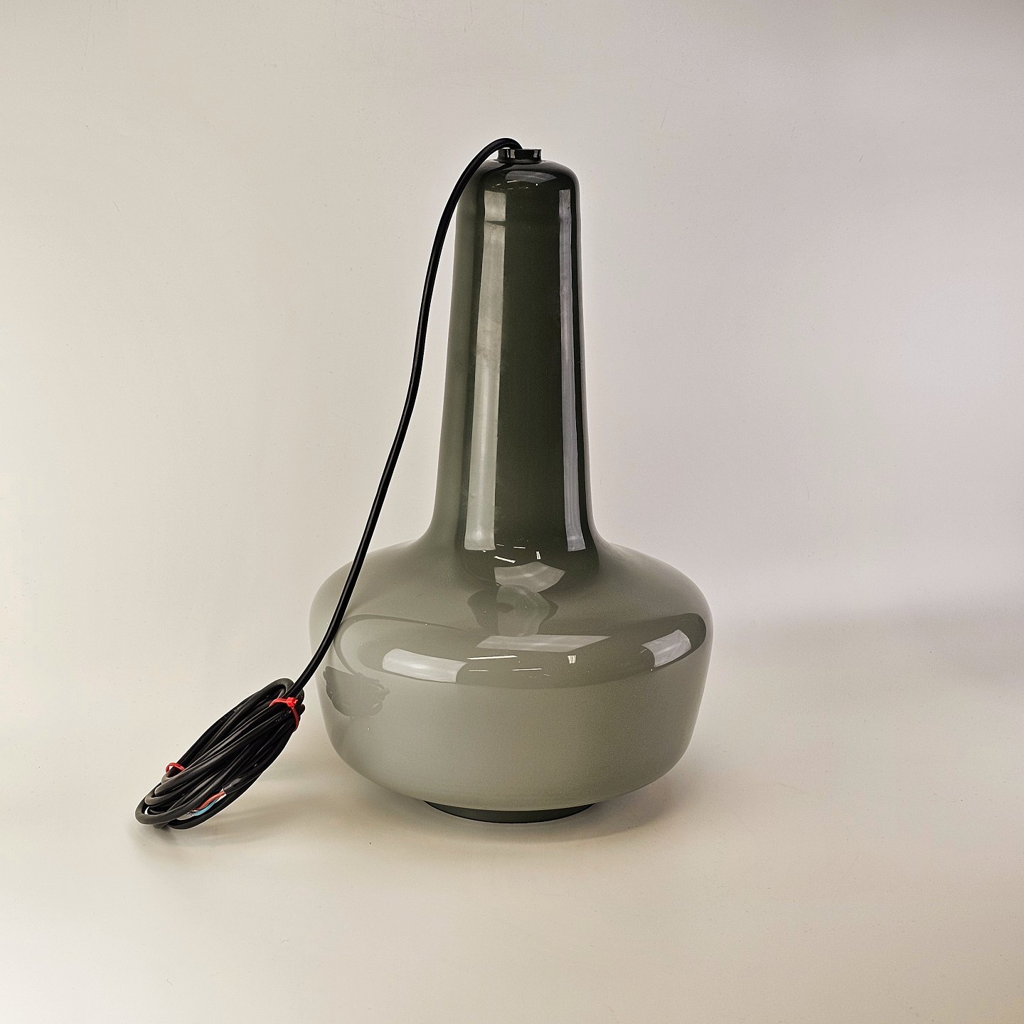 Text available in Danish: Pendel i opal glas, grågrøn by ydersiden og hvid på indersiden