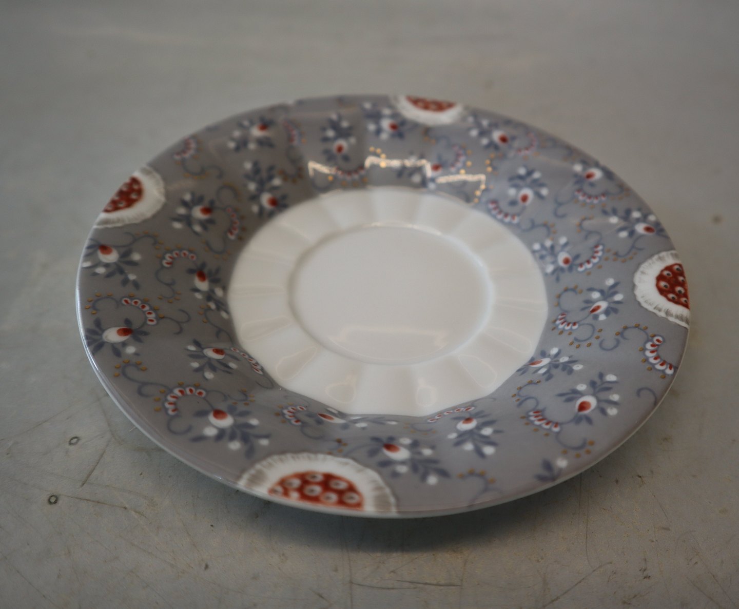 072 Coffee cup 15 cl & saucer 073 13.7 cm (8608) The Royal Copenhagen Fairytale Pattern was designed by Finn Næss-Schmidt and the actual drawings for the transferware were designed by Jørgen Nielsen . The Fairytale service was decorated on the Angular form in both Grey and Terracotta versions so that all pieces would mix and match. At the time of production it was the most complex multicolor transferware ever produced by the Royal Copenhagen Factory.