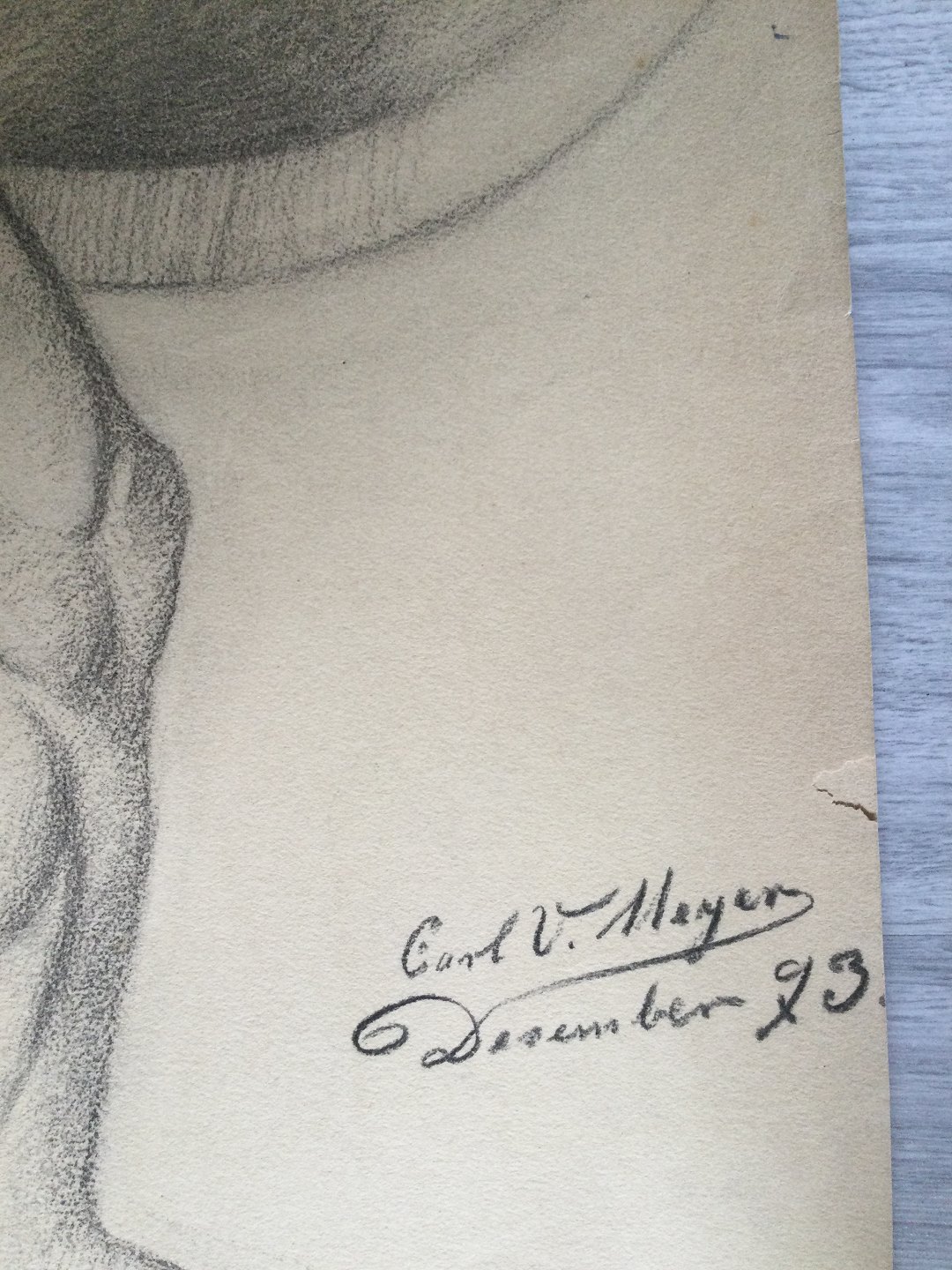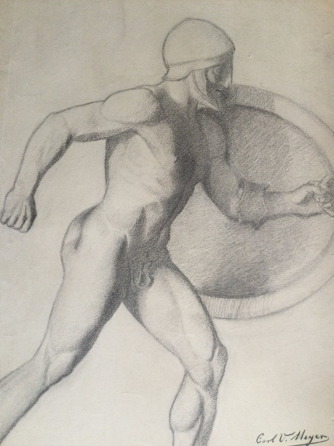 Text available in Danish: Akademitegning af Carl V. Meyer - Nøgen kriger med skjold 1893.