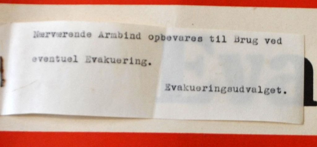 Evacuation armband in paper, 1940 - 1945, 2. WW. Denmark. 36 x 8.5 cm. With attached paper note with the text: This armband is kept for use in case of possible Evacuation. Evacuation Committee.