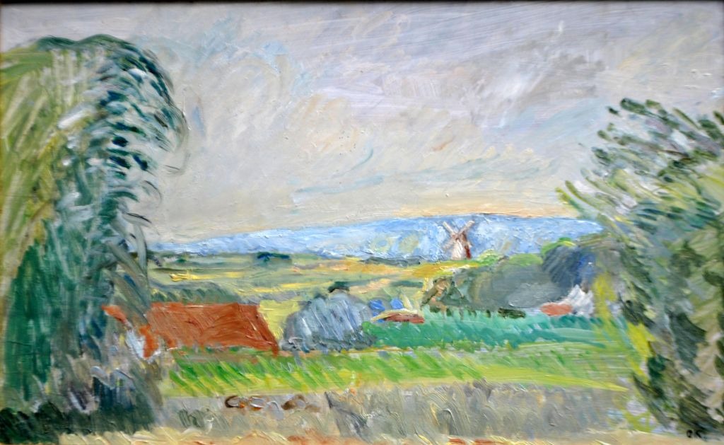 Kielberg, Ole (1911 - 1985) Denmark: Karlebo Mølle, 1961. Oil on masonite. Signed: OK. Signed on the back: Ole Kielberg Karlebo Mølle 1961. 38 x 60 cm.
