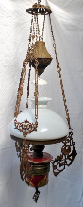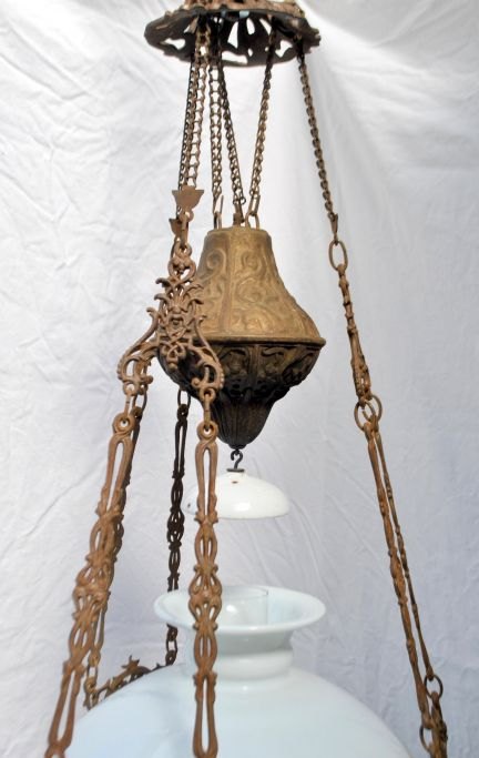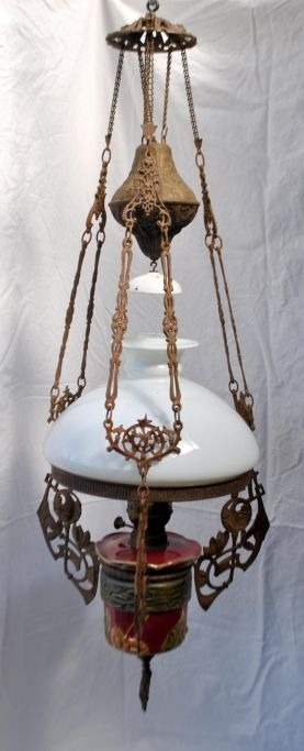 Petroleum hanging lamp with majolica, 19th century. Majolica faience in plum color with flowers. Iron hooks decorated with rose branches. With fire glass. White glass shade dia: 35 cm. L. incl. hook: 108 cm. Dia: 40 cm.