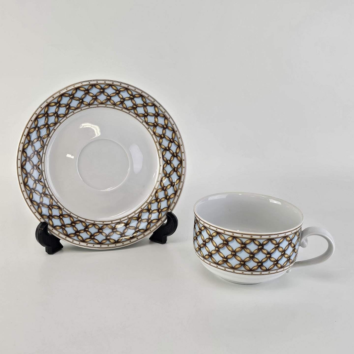 Liselund er hvidt porcelæn dekoreret i lyseblå eller mørkeblå nuancer med fletmønster