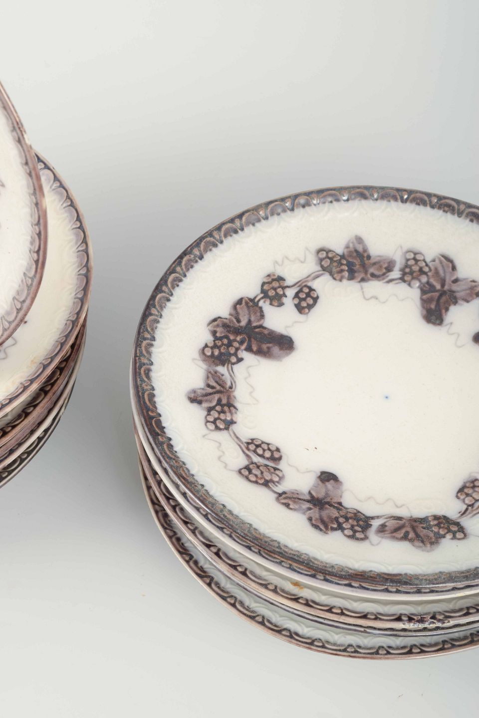 Set of 12 round faience plates with relief decoration and grapevine motif in a brownish tone along the rim.