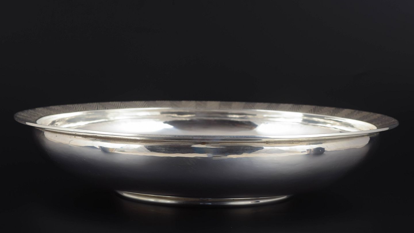 Round sterling silver bowl with a plain polished mirror surface and rim decorated with engraved pattern.