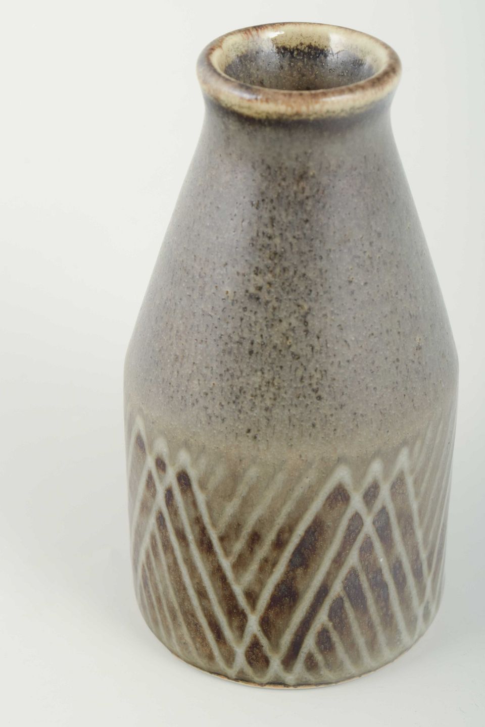 Cylindrical stoneware vase with brown glaze and incised geometric pattern in white decoration.