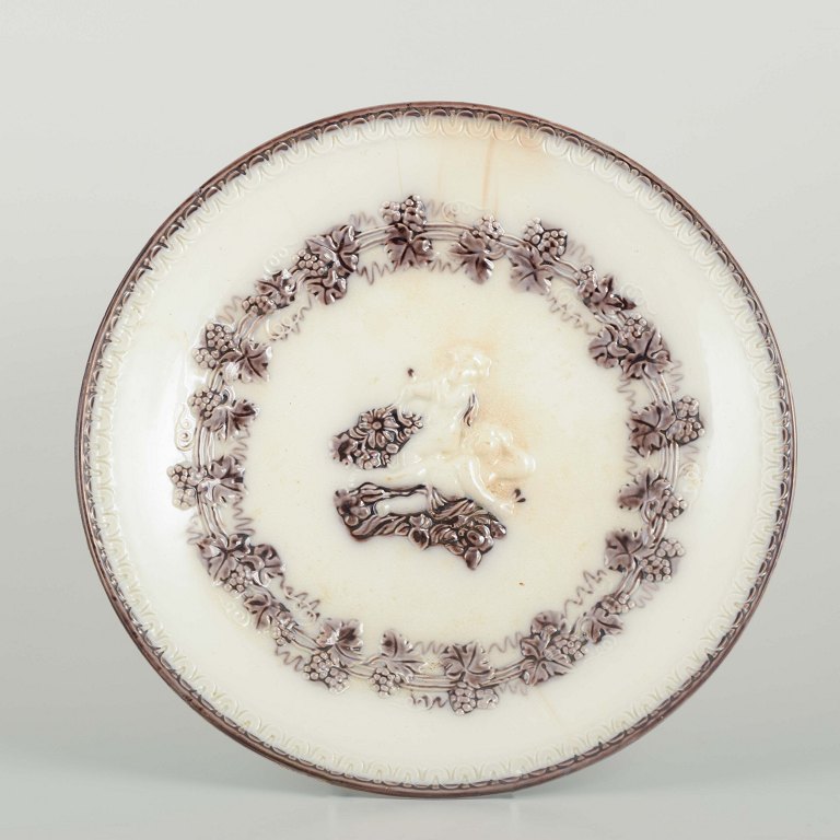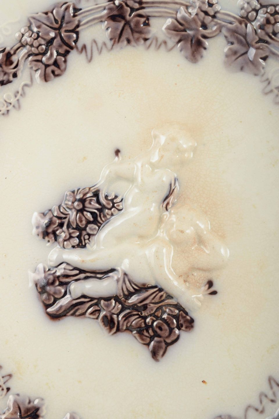 Round faience plate with relief decoration and transfer-printed vine motif in brown tone, centrally decorated with putti figures (cherubs/angels).