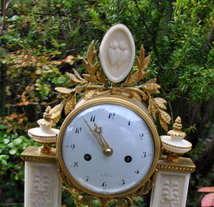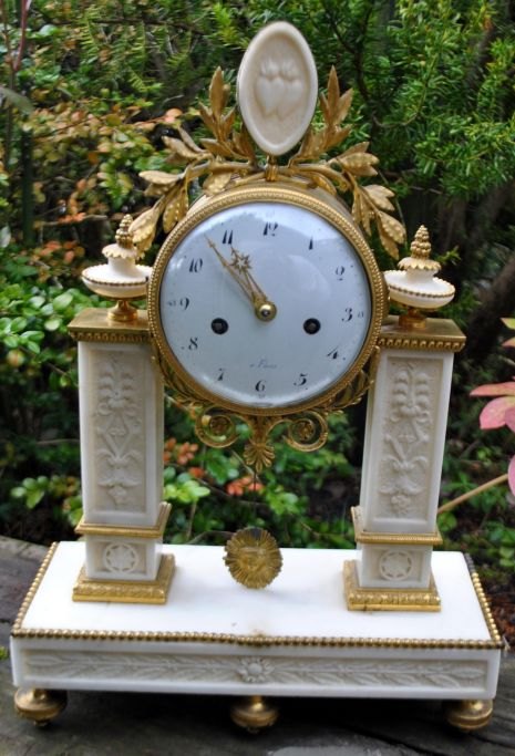 French column clock of gilt bronze and white marble, empire, ca. 1830. Columns and base with decoration. Clock case decorated with foliage in gilt bronze. Top marble plaque with two hearts on fire. Standard clockwork with bell. Dial in white enamel with Arabic numerals. With pendulum with sun.H. cm. W.: 31 cm. D.: 12 cm. : 43