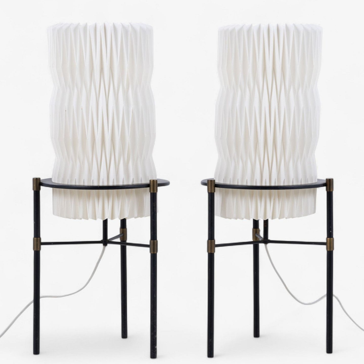 Pair of table lamps on tripod base in black lacquered metal with white pleated shades.