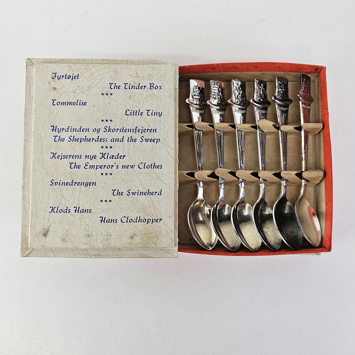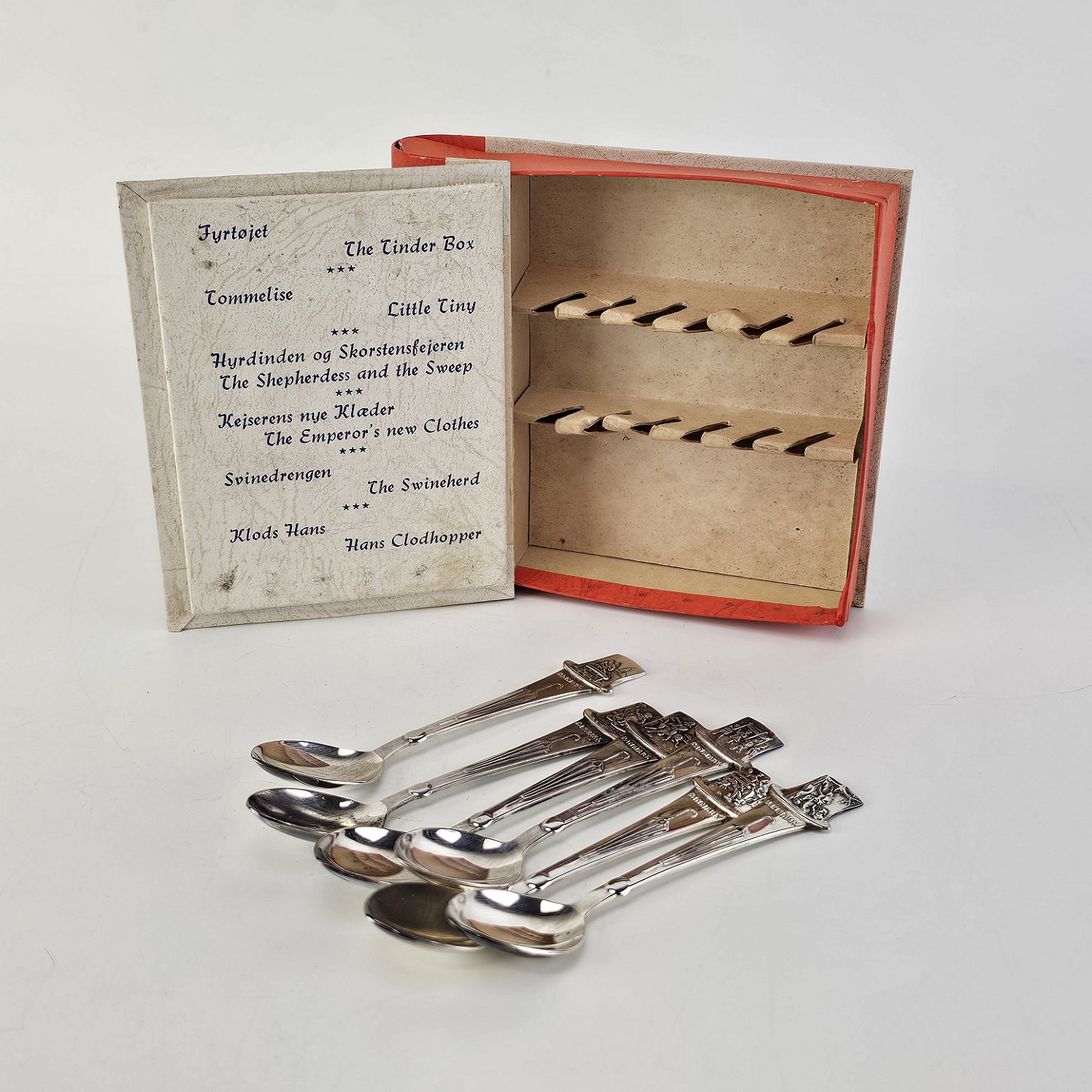 En lille bog med seks pletsølvskeer, alle med forskellige motiver fra H. C. Andersens eventyr