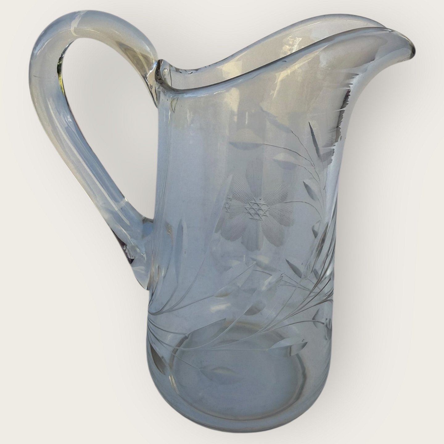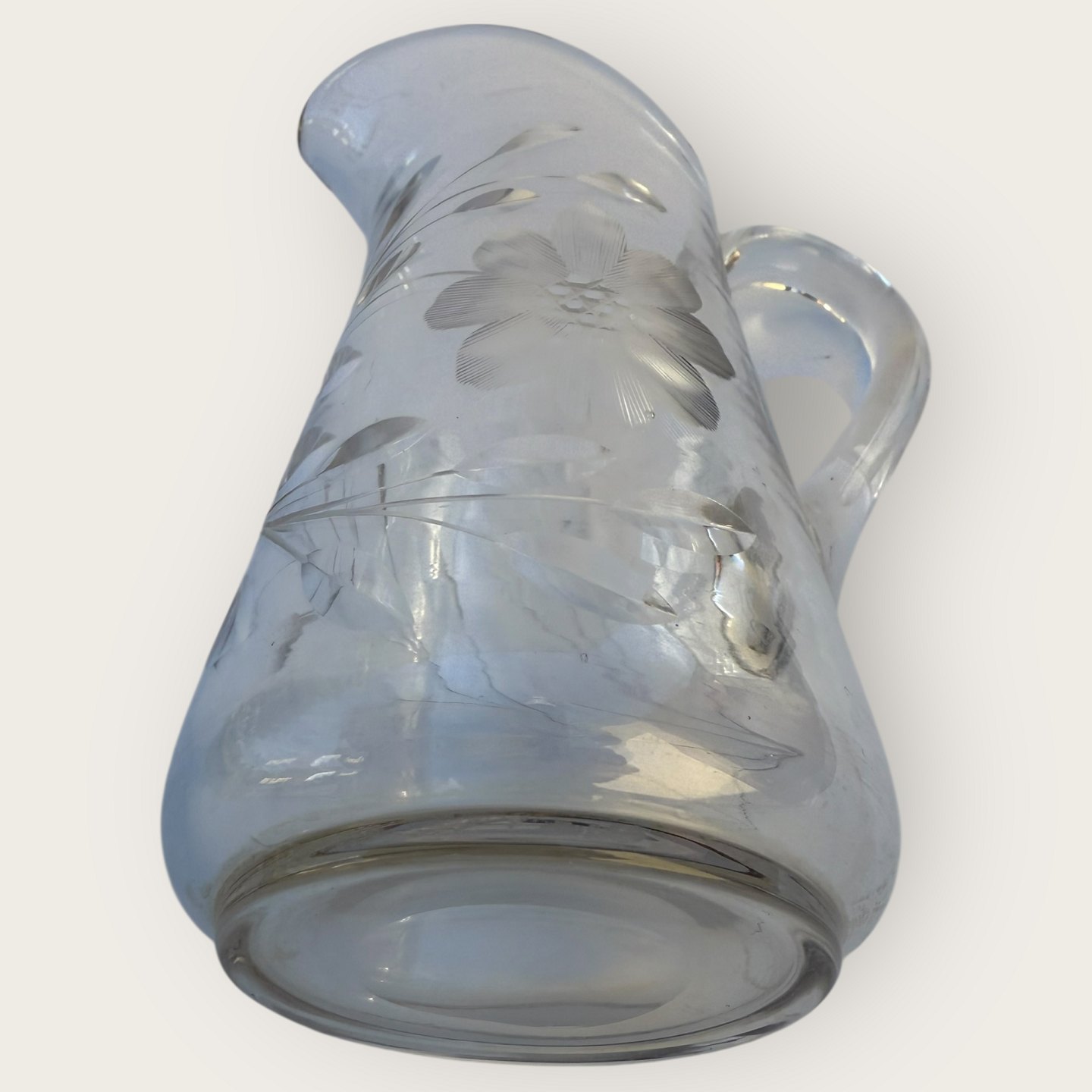 Glass jug, with flower cuts, 17cm high, 14x9cm wide, *Good condition*