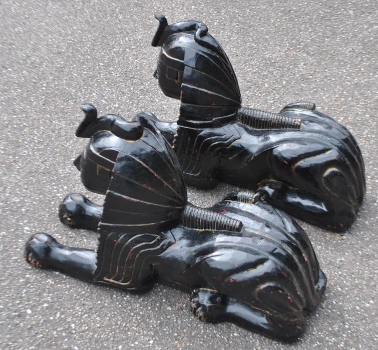 Pair of large decorative black-painted wooden sphinxes, 20th century, Egypt. L.: 65 cm. W.: 22 cm. H.: 44 cm.